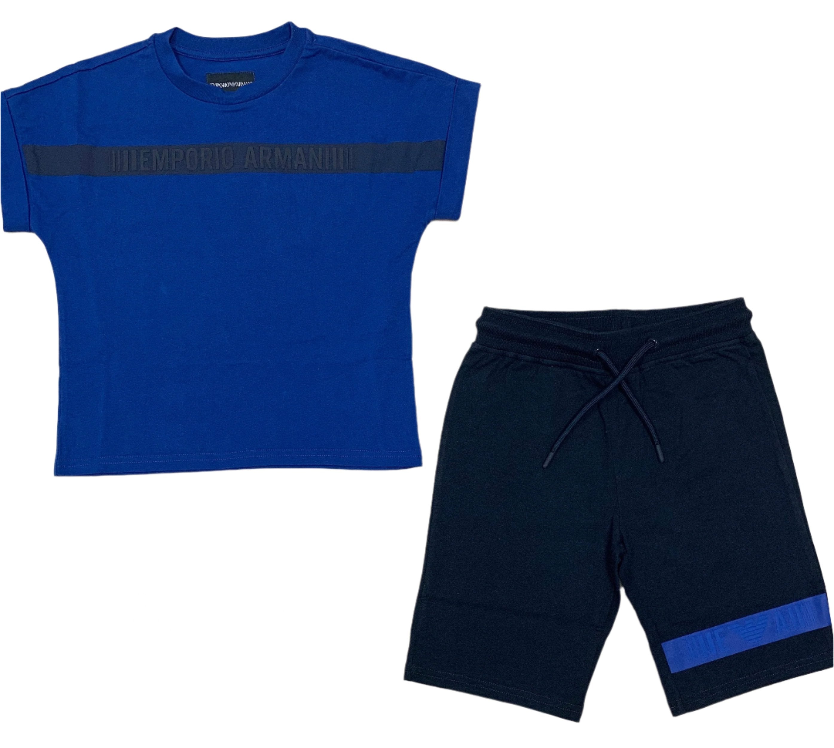 Blue t-shirt is made from soft cotton jersey with textured 'Emporio Armani' and with a round neckline and cuffs on the sleeves. Shorts has a wide elastic drawstring waistband and textured logo on the left side of the leg. Highly breathable and comfortable to wear.