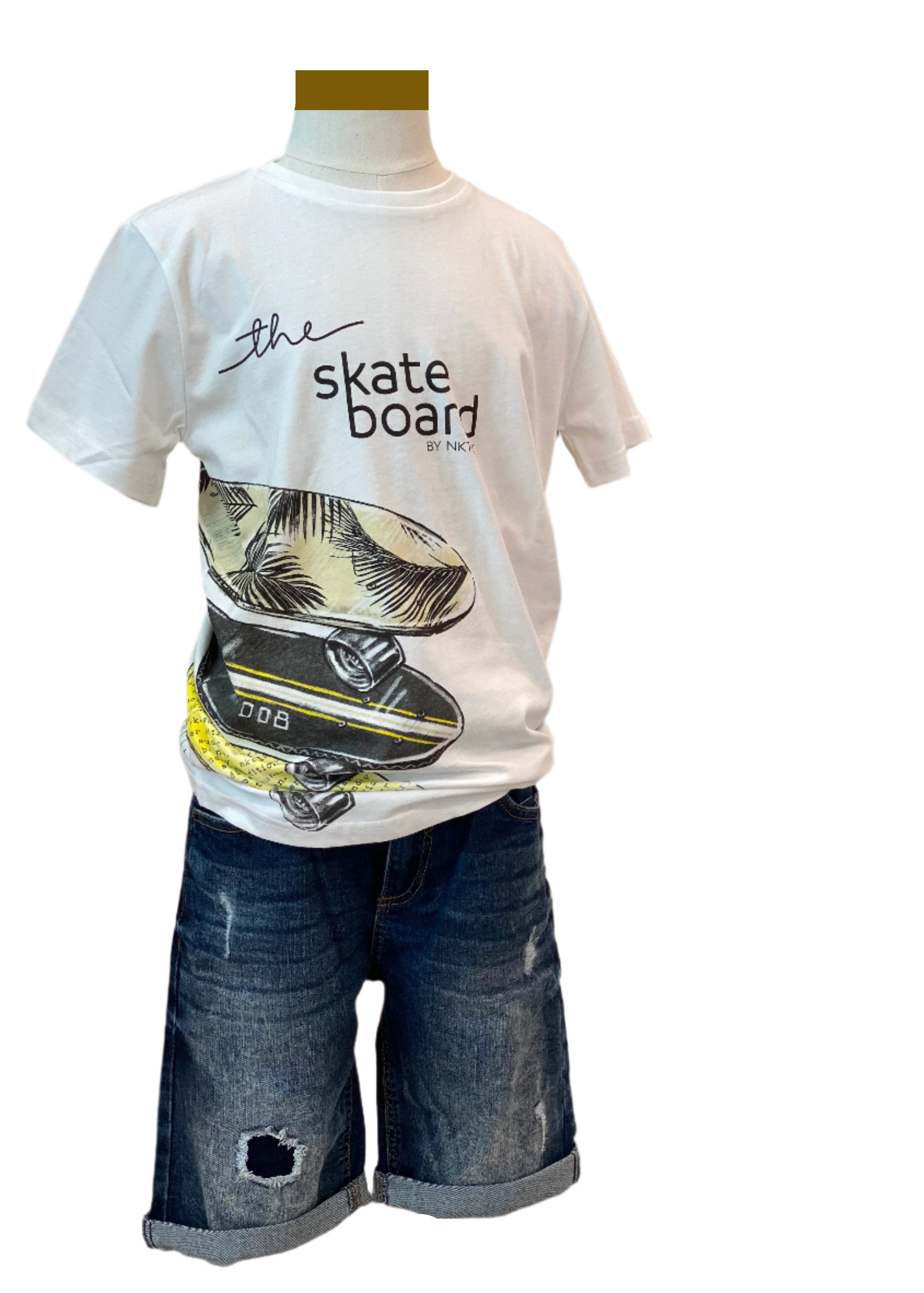 T-shirt is made of comfortable cotton and has 'The Skateboard by NKTVK' print on the chest. Classic cut with short sleeves and narrow ribbing neckline. Denim shorts has belt loops, elasticated waistband, zipper and button for fastening. Also it has five pockets.