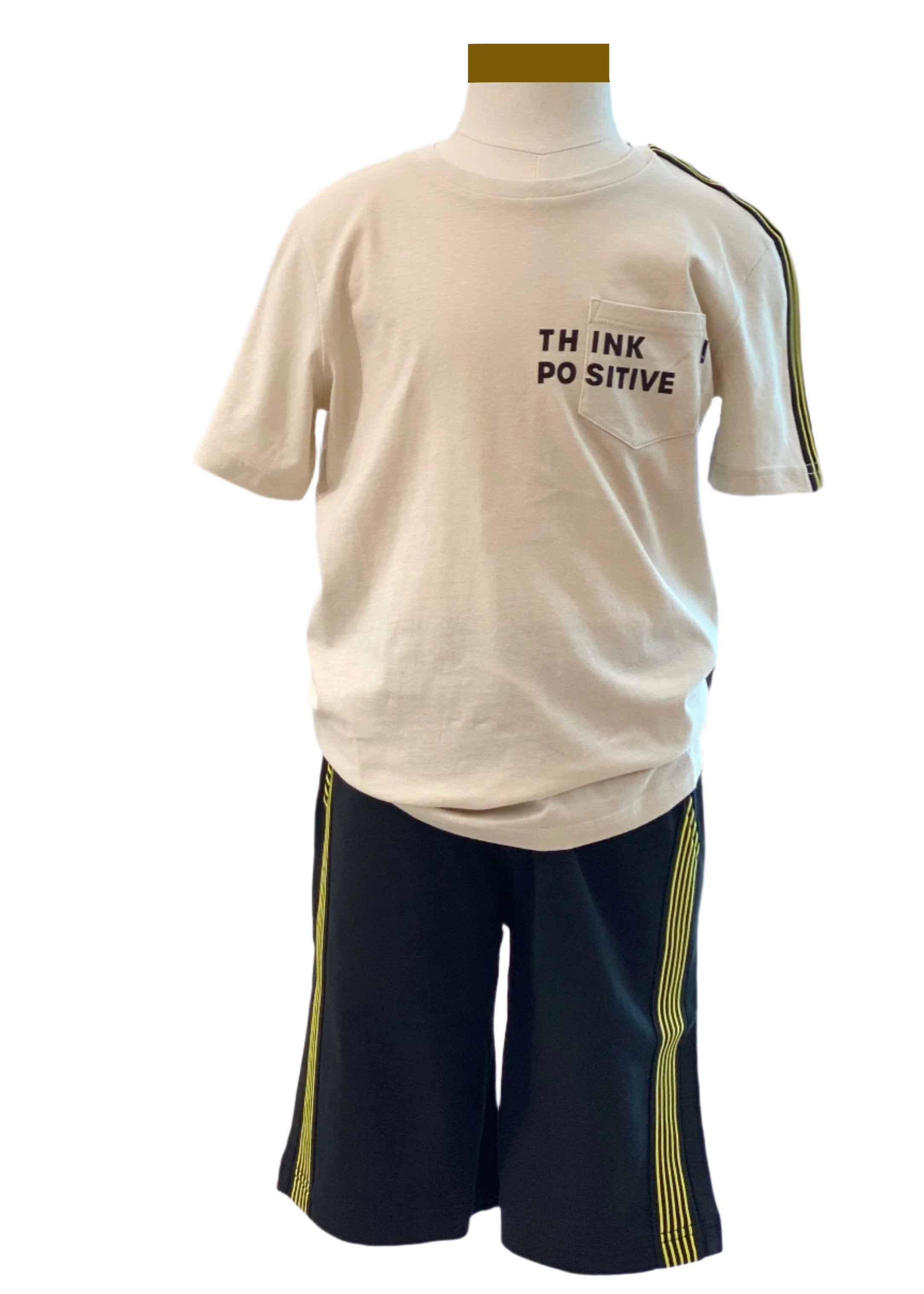 Beige knitted t-shirt with 'Think Positive' print and pocket on the chest. Black knitted tape with stripes along the shoulder seams and sleeves. Shorts has side pockets with a cut-off side. Knitted tape with stripes along the side seams. Has elasticated waistband and drawstring for adjustment.