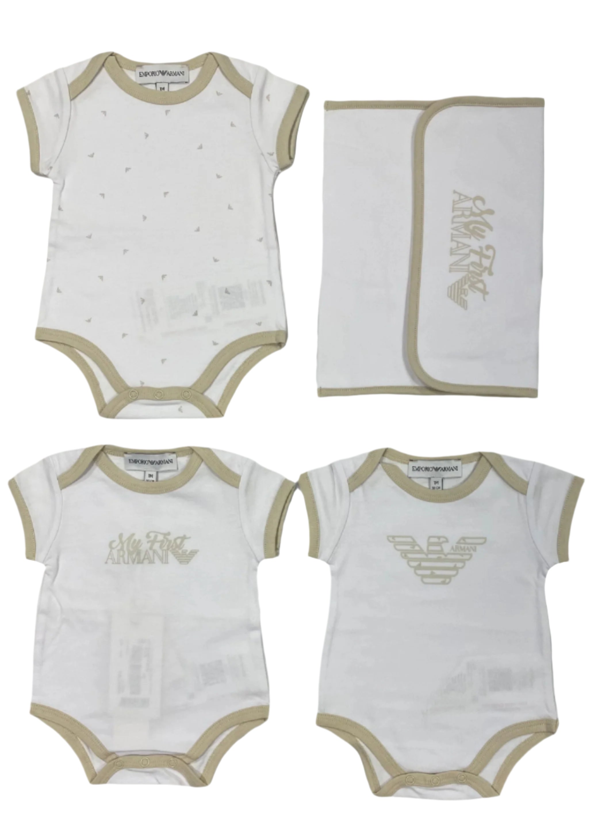 Soft and comfortable bodysuit for baby. One body suit has 'My First Armani' print on the chest, one has eagle logo print on the chest and other one has all over eagle logo print. Snap button fastening in between legs. Cloth sack included.