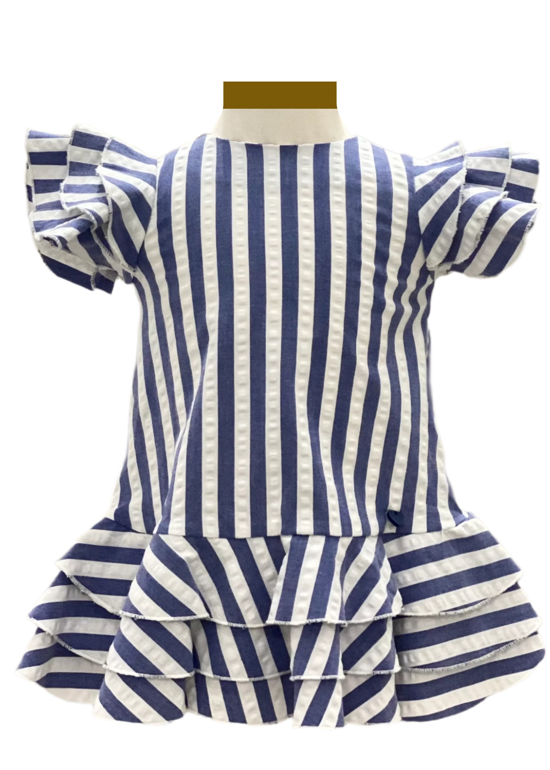 Pretty stripe dress with layers on sleeves and skirt. Zip fastening at the back.