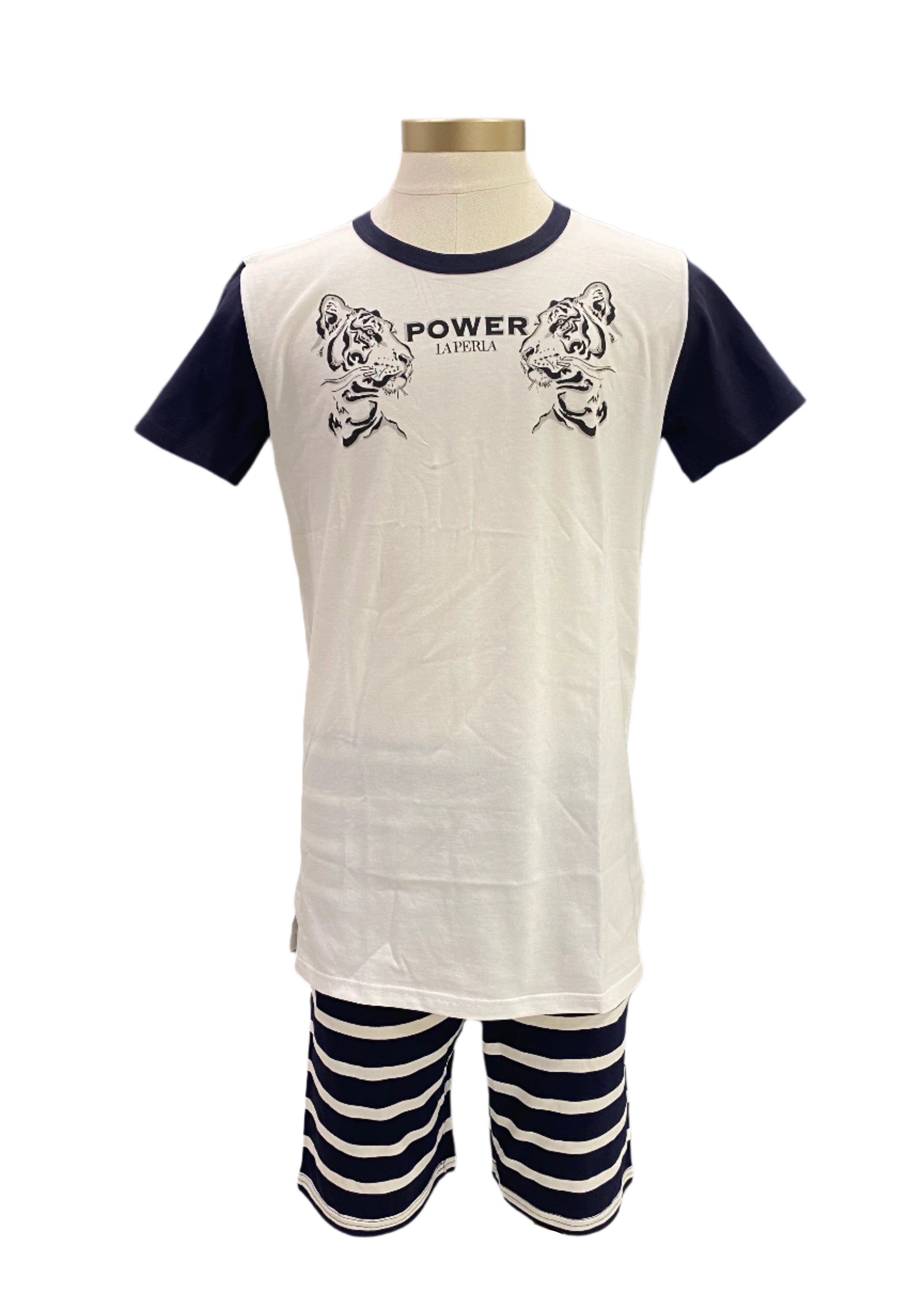 Boys navy blue and white pyjamas by La Perla, made from soft cotton jersey. The short-sleeved T-shirt features two tiger print design while the stripe shorts have an elasticated waistband.
