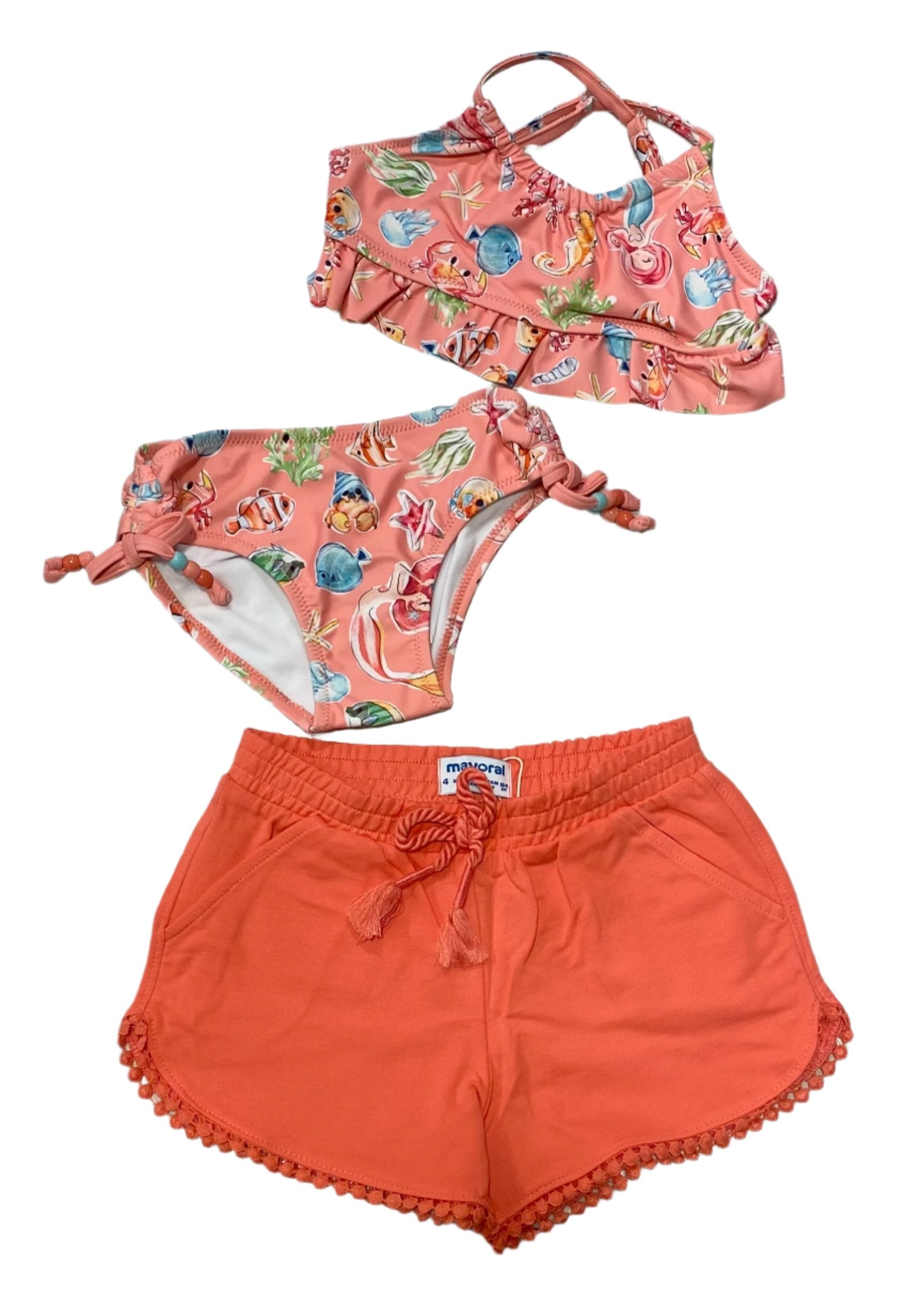 Lovely two-piece swimsuit and short set. Stylish two-piece swimsuit designed with under the sea theme print and a matching stylish soft short with ribbon.