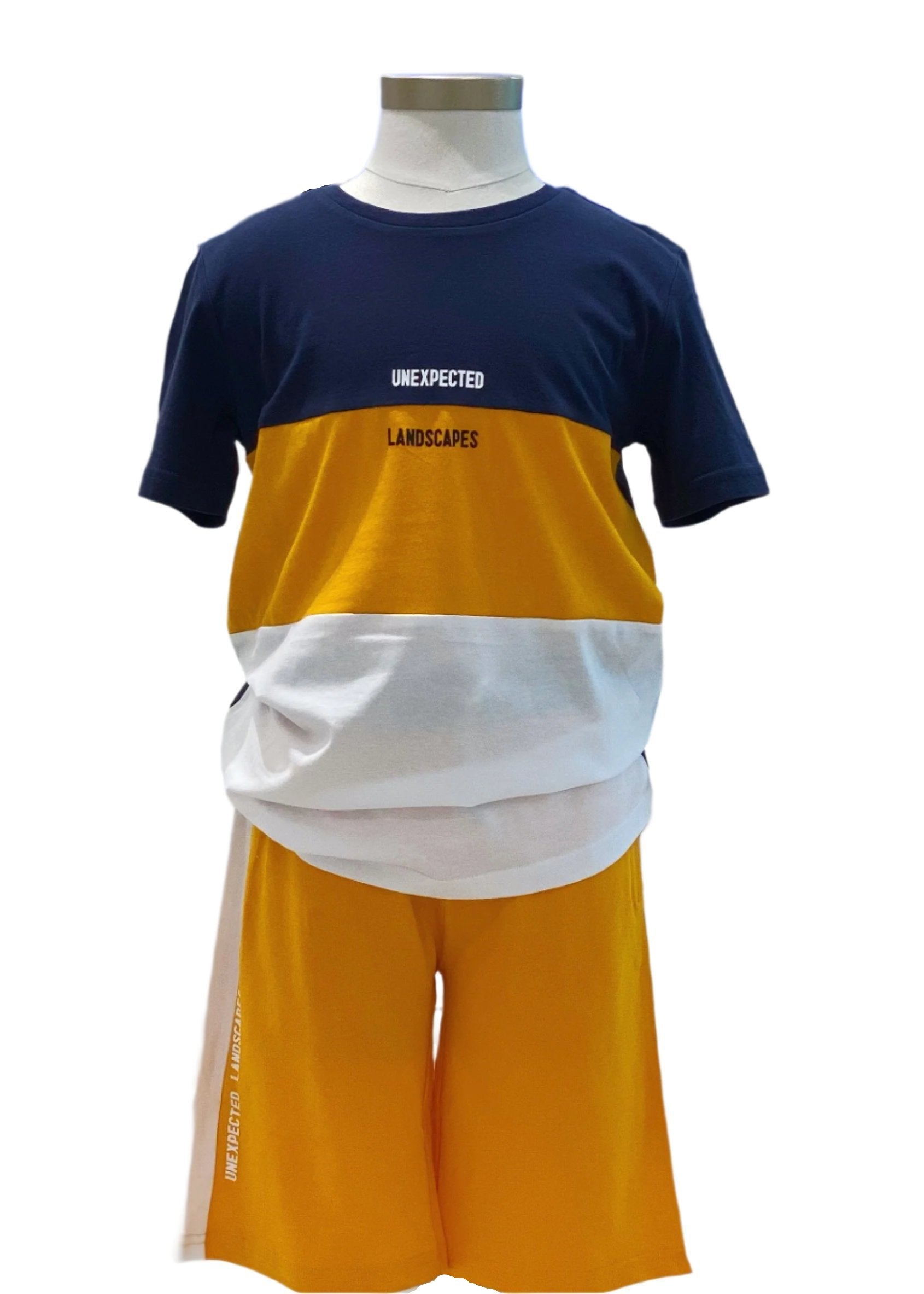 Made of soft cotton. Has a classic cut with short sleeves and narrow ribbing at the neckline. Short has a wide elastic wasitband and drawstring.