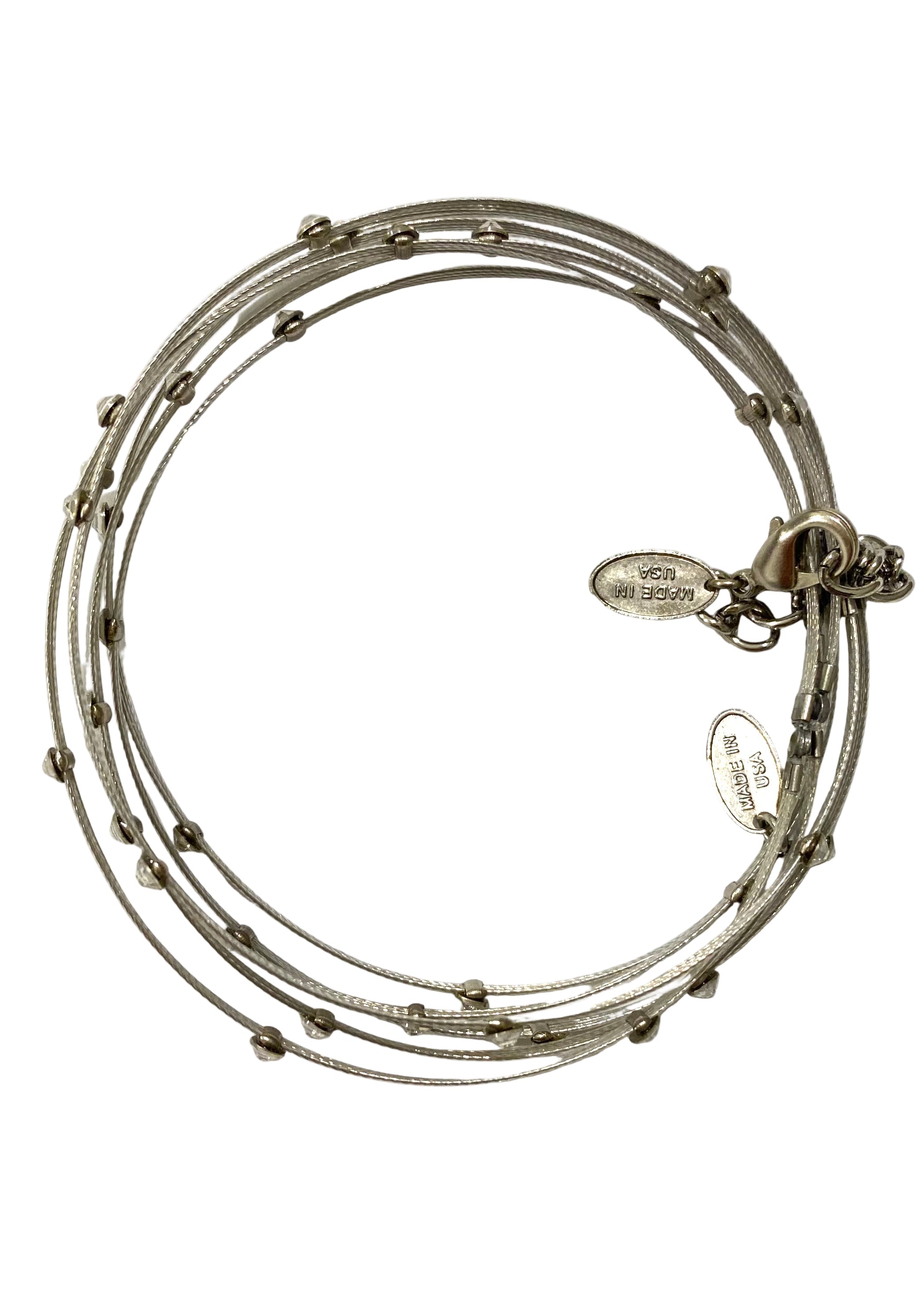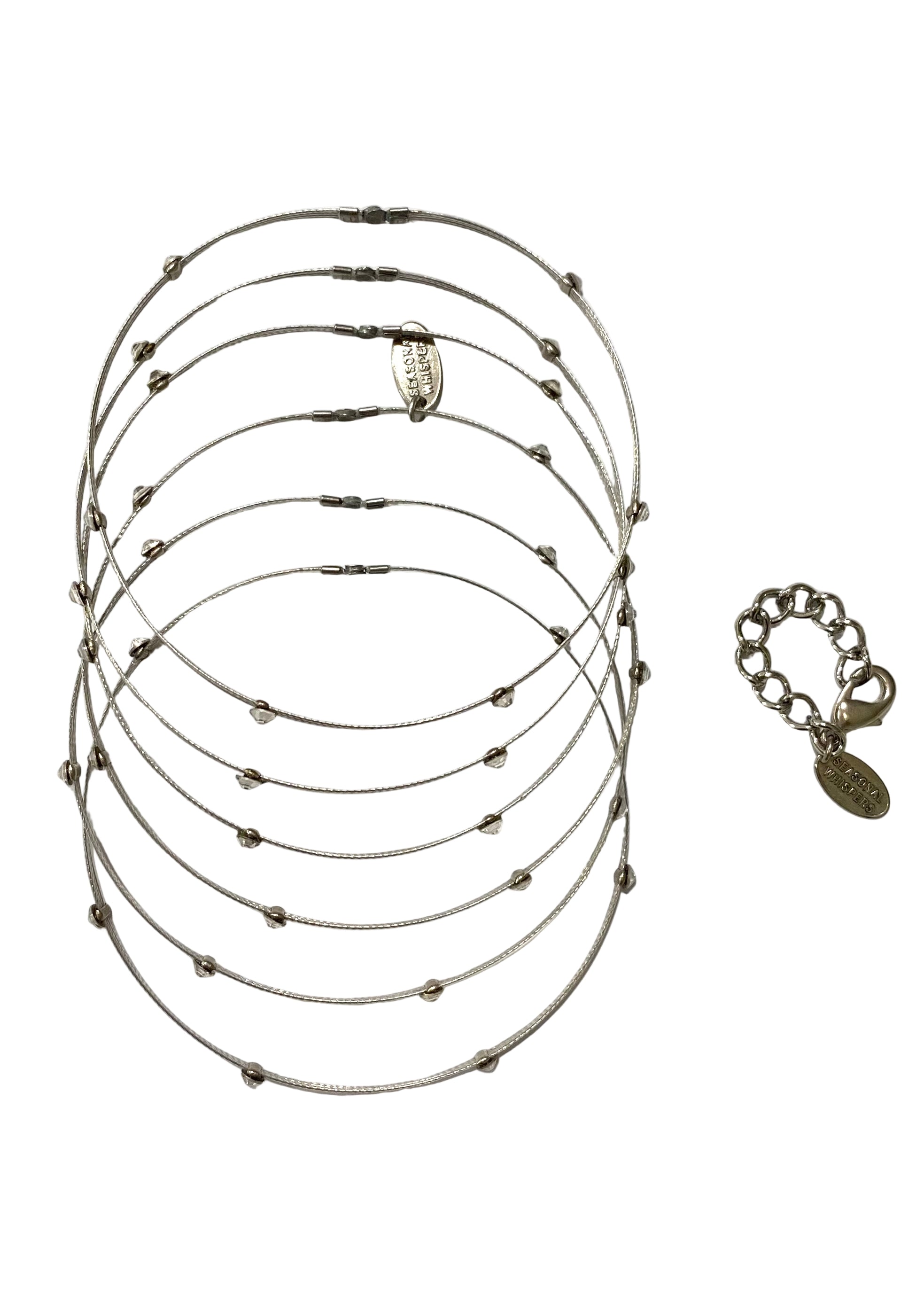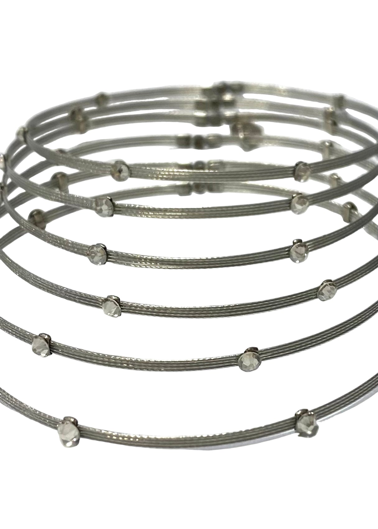 Stack of six semplice wired silver bangles with crystal design. A product of Utterchic from USA.