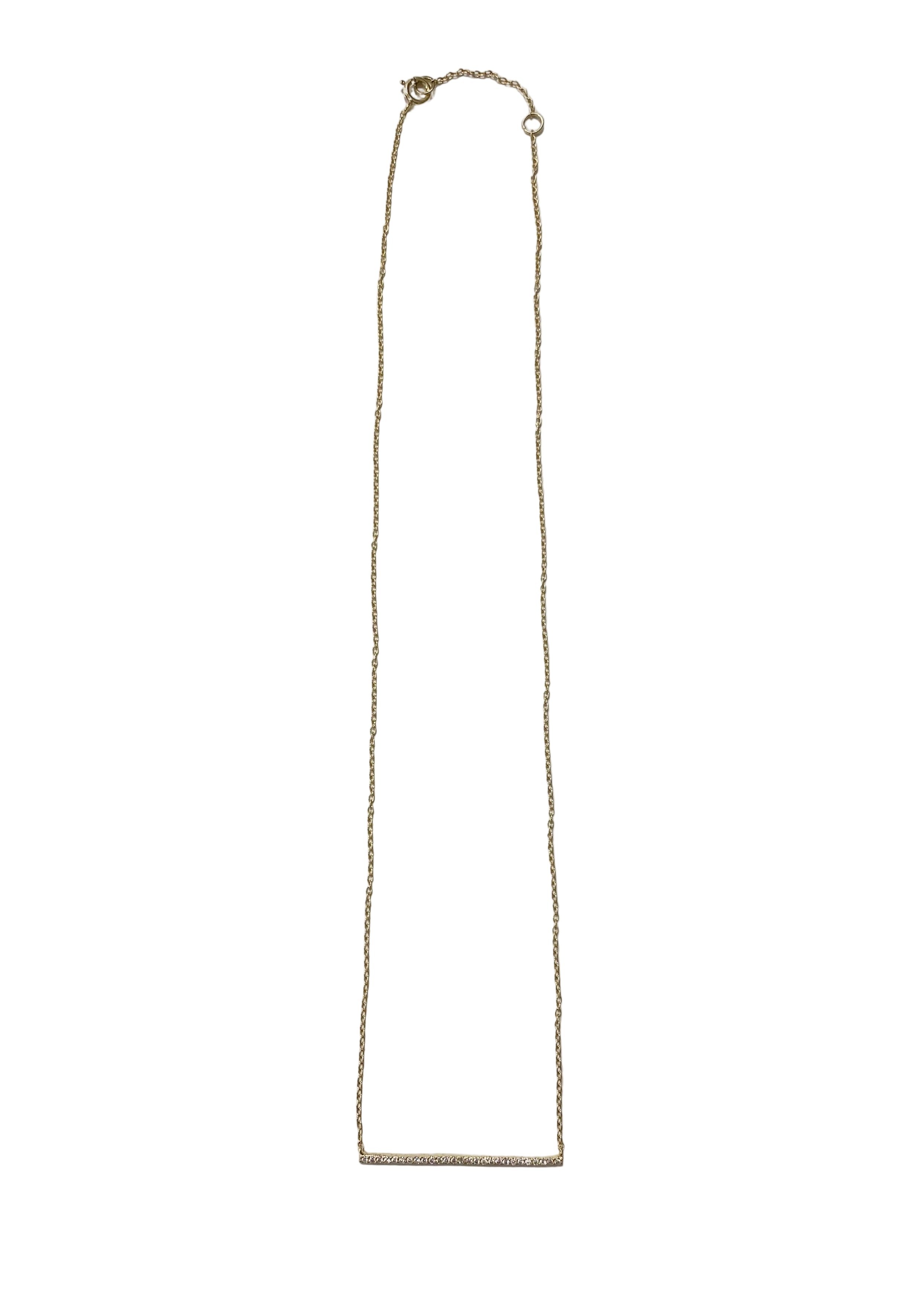A gold necklace with bar pendant, enhanced with crystals. A product of Utterchic.