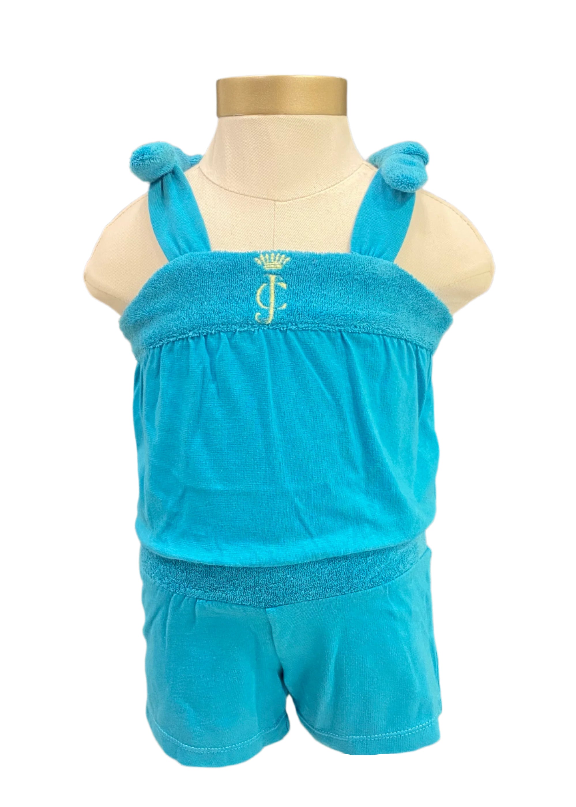 Baby romper in velour fabric with strap at shoulders with juicy couture logo.