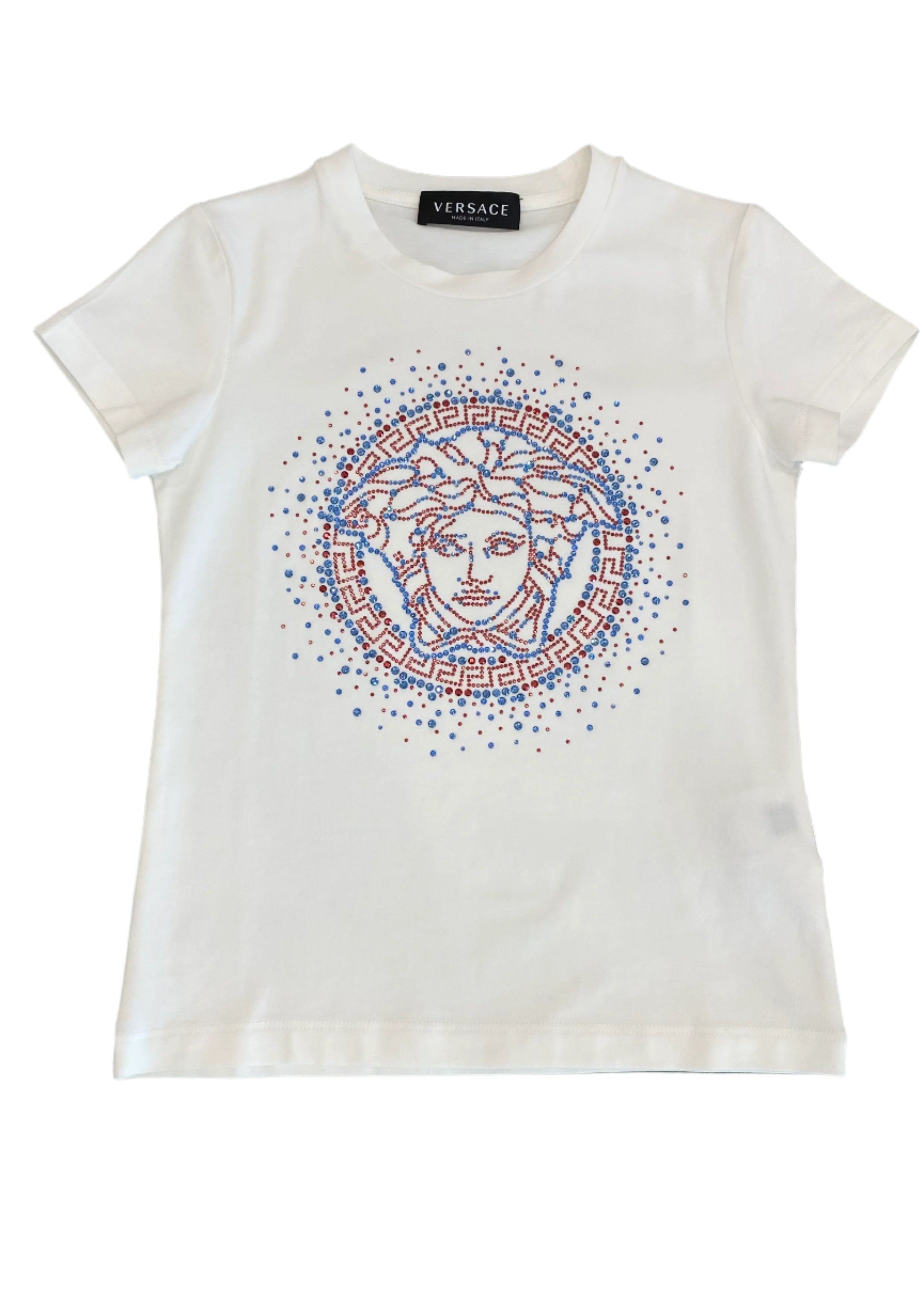 Crew neck t-shirt for girl. Made with a soft cotton jersey which makes it comfortable to wear. Designed with a classic Versace medusa logo in red and blue crystals and studs.