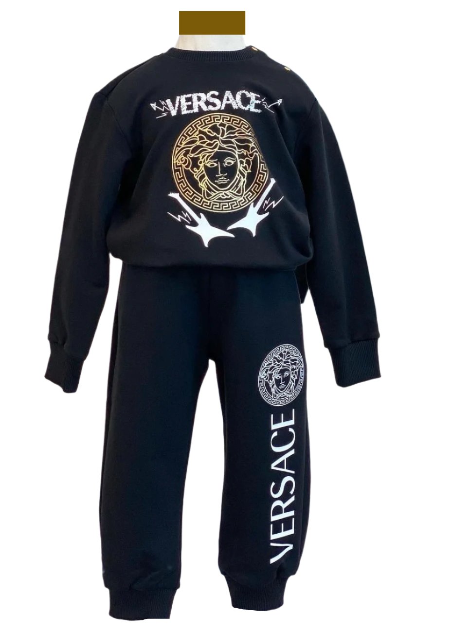 Loose, warm comfortable to wear. This set comes with a sweater designed with rock and roll theme print, rib collar neckline and sleeve hem, snap button fasten on one shoulder for easy wearing. Sweater is perfectly matched with a soft pant elasticated on the waist and leg hem. Both sweater and pants are designed with medusa logo and 'VERSACE' writing.