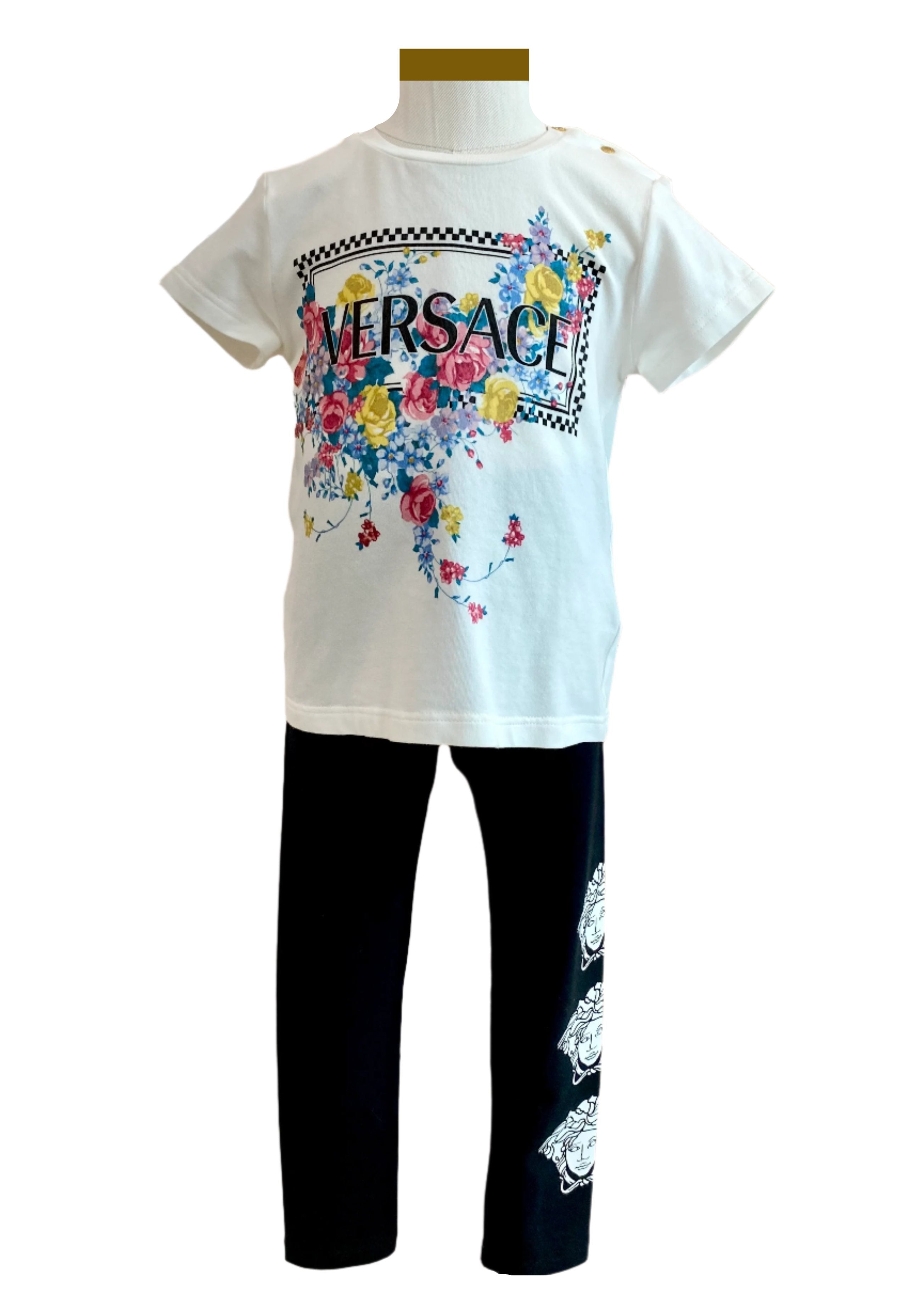 Casual, comfortable leggings set. Top is designed with colorful roses print and 'VERSACE' writing, has snap button fastening on one shoulder. The top is matched with a soft, stretchy leggings with medusa logo print.