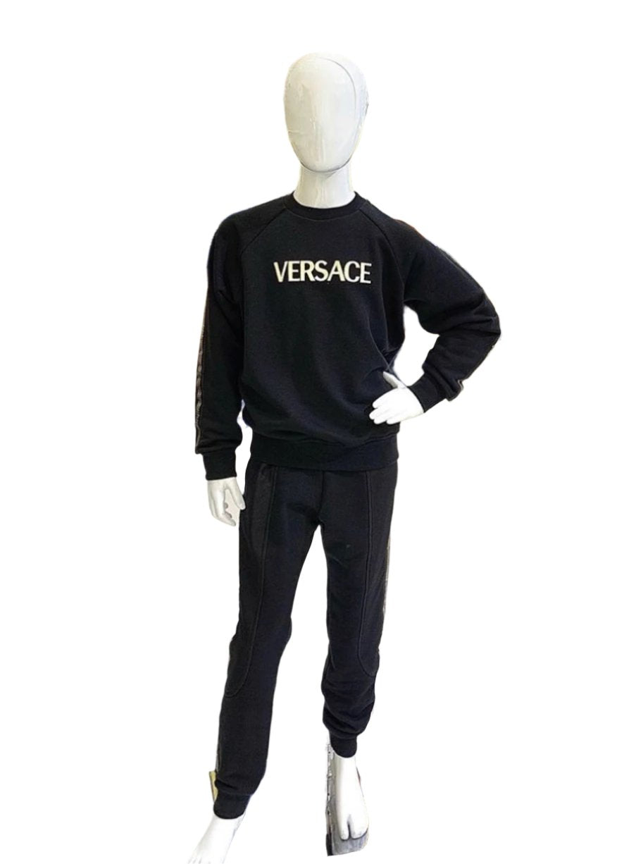 Smart, tracksuit set for boy. This set comes with a sweater embroidered with golden 'VERSACE' on the chest, and golden leaf and Greek fret pattern on both sleeves, elasticated on sleeve hem. Matching pants has golden leaf and Greek fret pattern on both sides, elasticated on the waist and on leg hem, finished with pockets in mesh fabric.