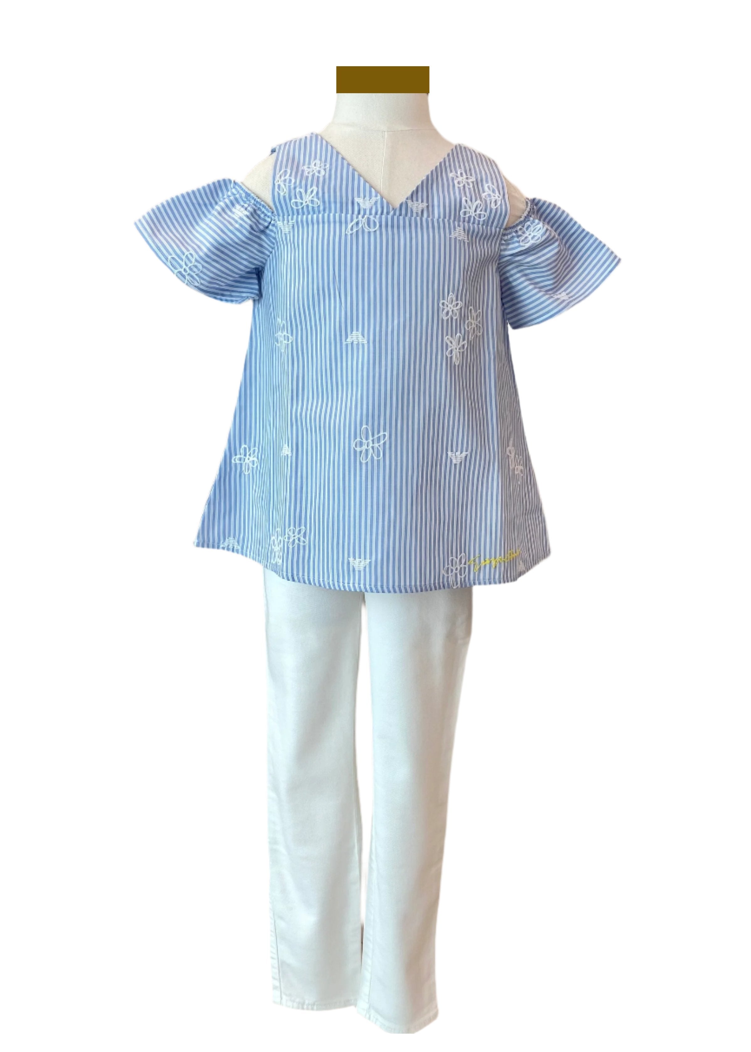 A loose light blue top with thin white stripes is made of soft oxford cotton. The cutouts that reveal the shoulders and the embroidery with a floral motif and eagle logo. Jeans is sewn by the brand's craftsmen from a dense elastic material based on durable cotton and soft lyocella and modal fibers. Has decorated the front belt loop with a gold charm in the shape of a heart, and the back pocket with eagle metal gold emblem.