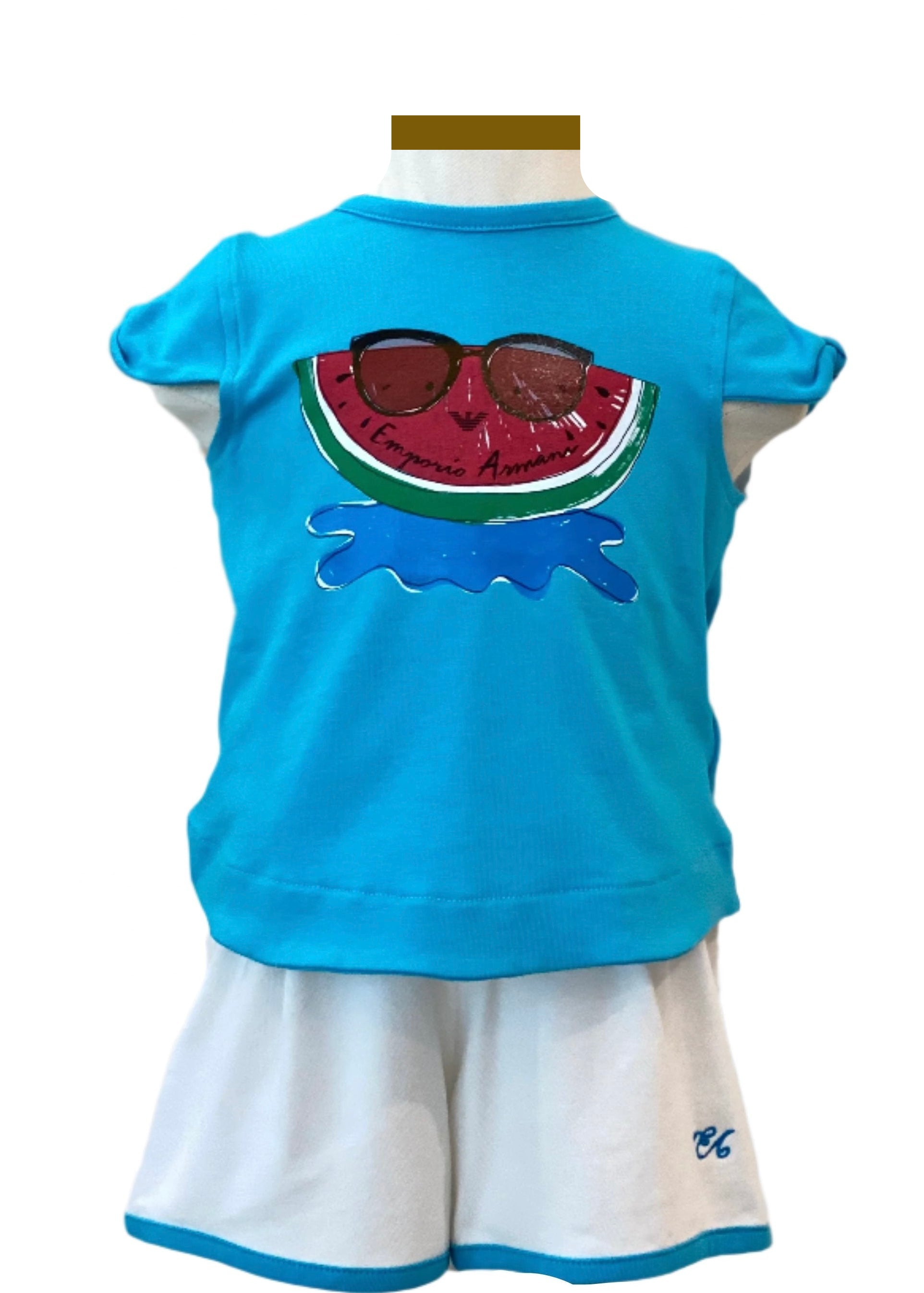 Adorable baby girl top and short shirt. T-shirt is designed with 'Emporio Armani' and a cool watermelon print on the chest and is matched with a soft short.