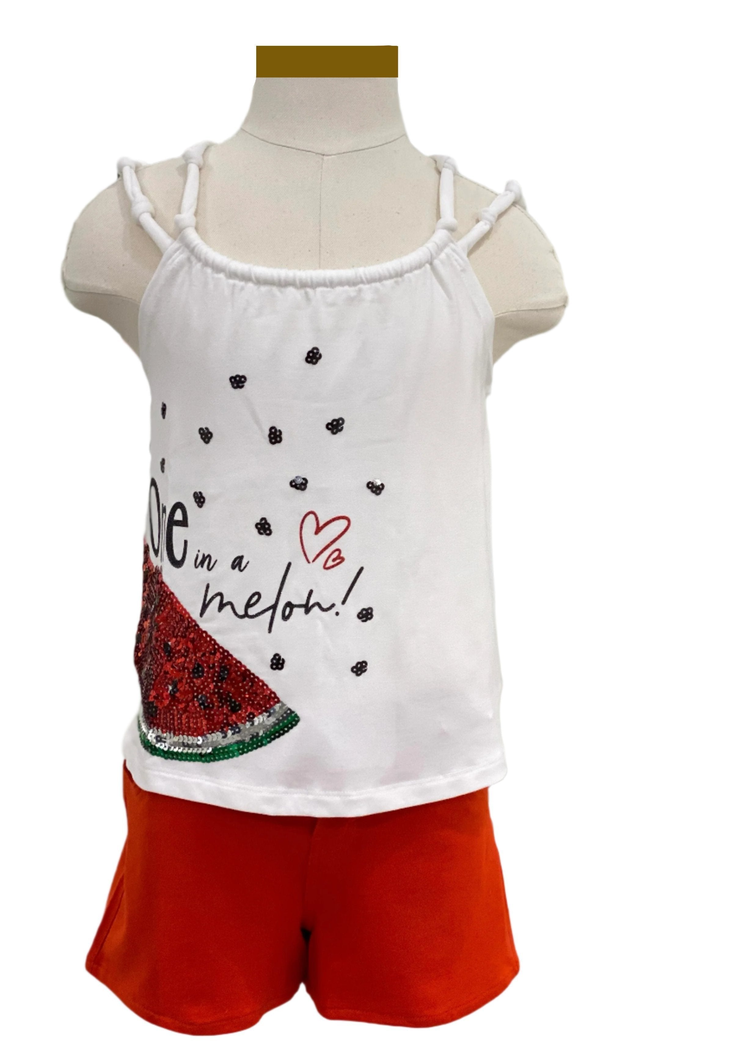 Sleeveless blouse with crossback strap and watermelon sequins. With red stretchable shorts has four pockets, belt loops and button for fastening.