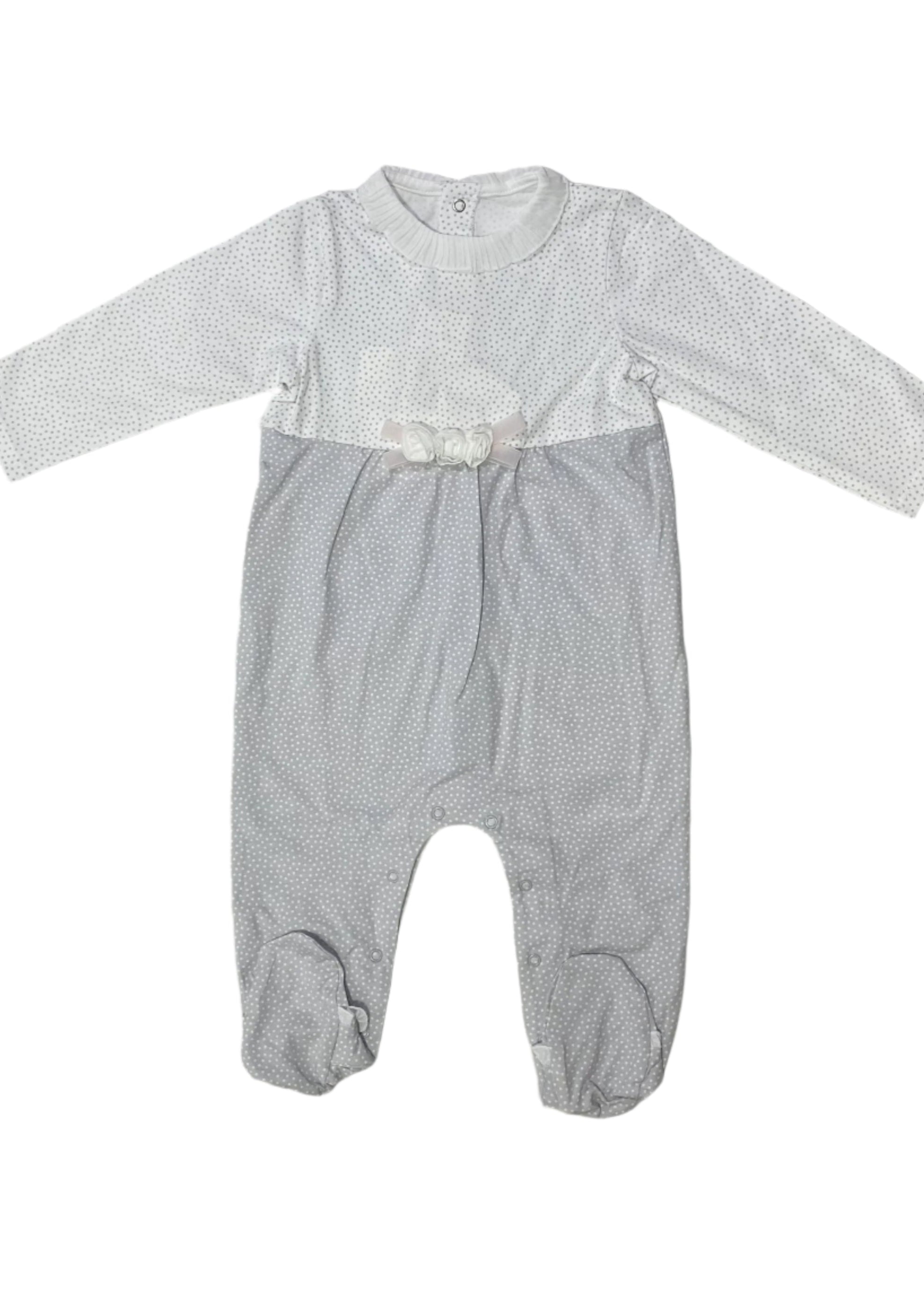An all over mini polka print romper. Designed with floral ribbon on the chest. Snap button fastening at the back and in between legs.