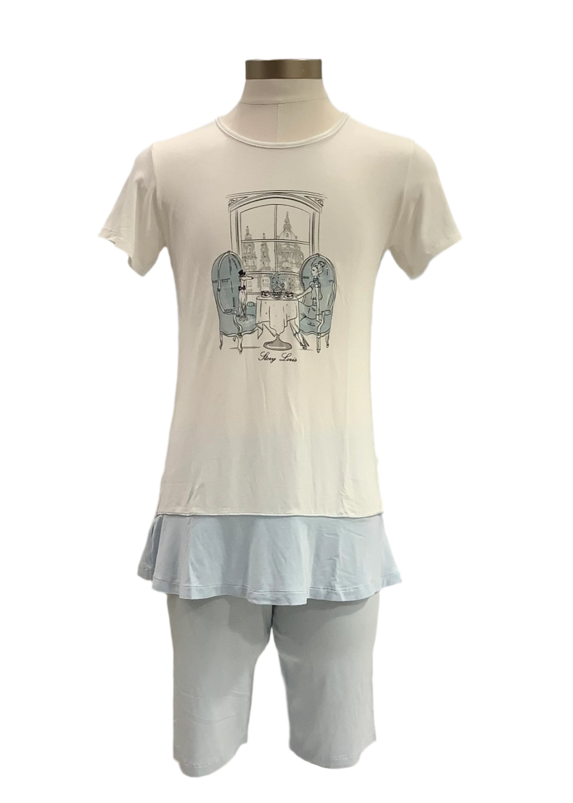A stylish pyjamas by Story Loris, made in super-soft fabric. The 2-piece set includes a short sleeve top with a round neckline, it has girl and dog having coffee together print with mini studs at the center. Matching with short that has elasticated waistband.