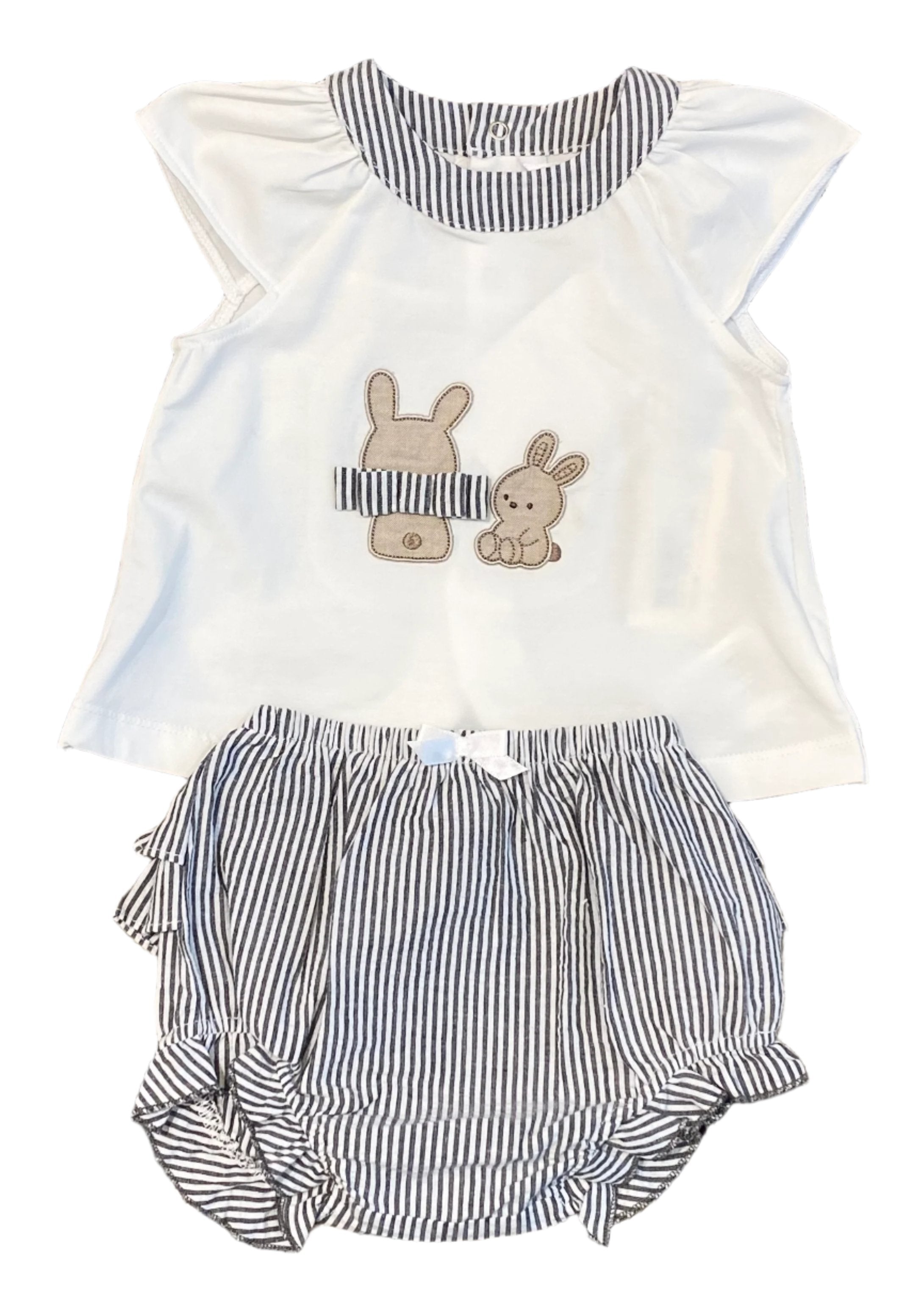 A chic outfit set for baby girl. The top is designed with bear embroideries, and has a stripe pattern detail on the neck. The top is matched with a striped knickers with elasticated waistband and has a layered ruffles at the back as a design.