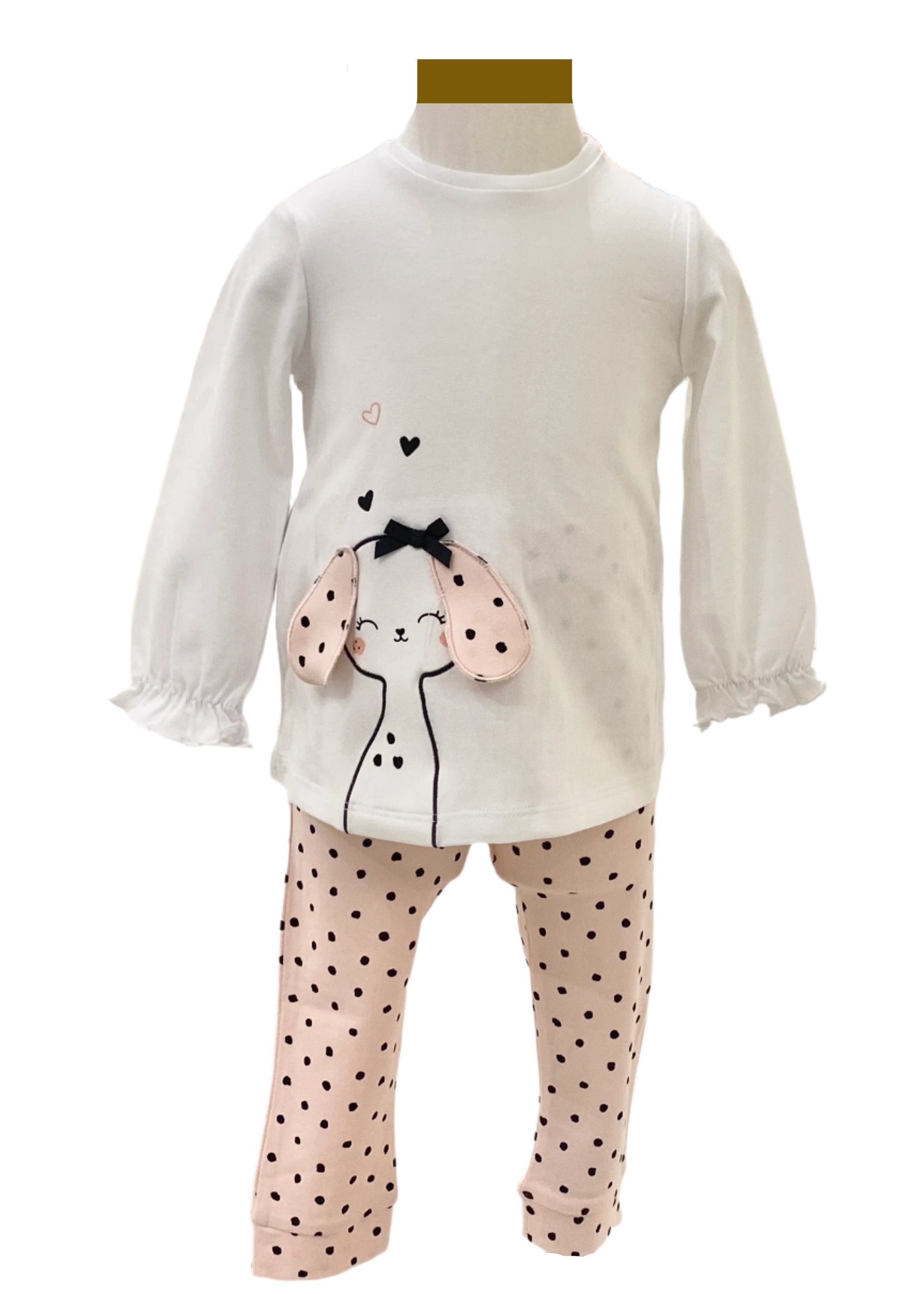 A soft, cottony casual outfit for your baby. This set comes with a long sleeves top, embroidered with puppy with an applique ear. The top is matched with an all over polka dots printed leggings with layered ruffles at the back. Fun and comfortable to wear.