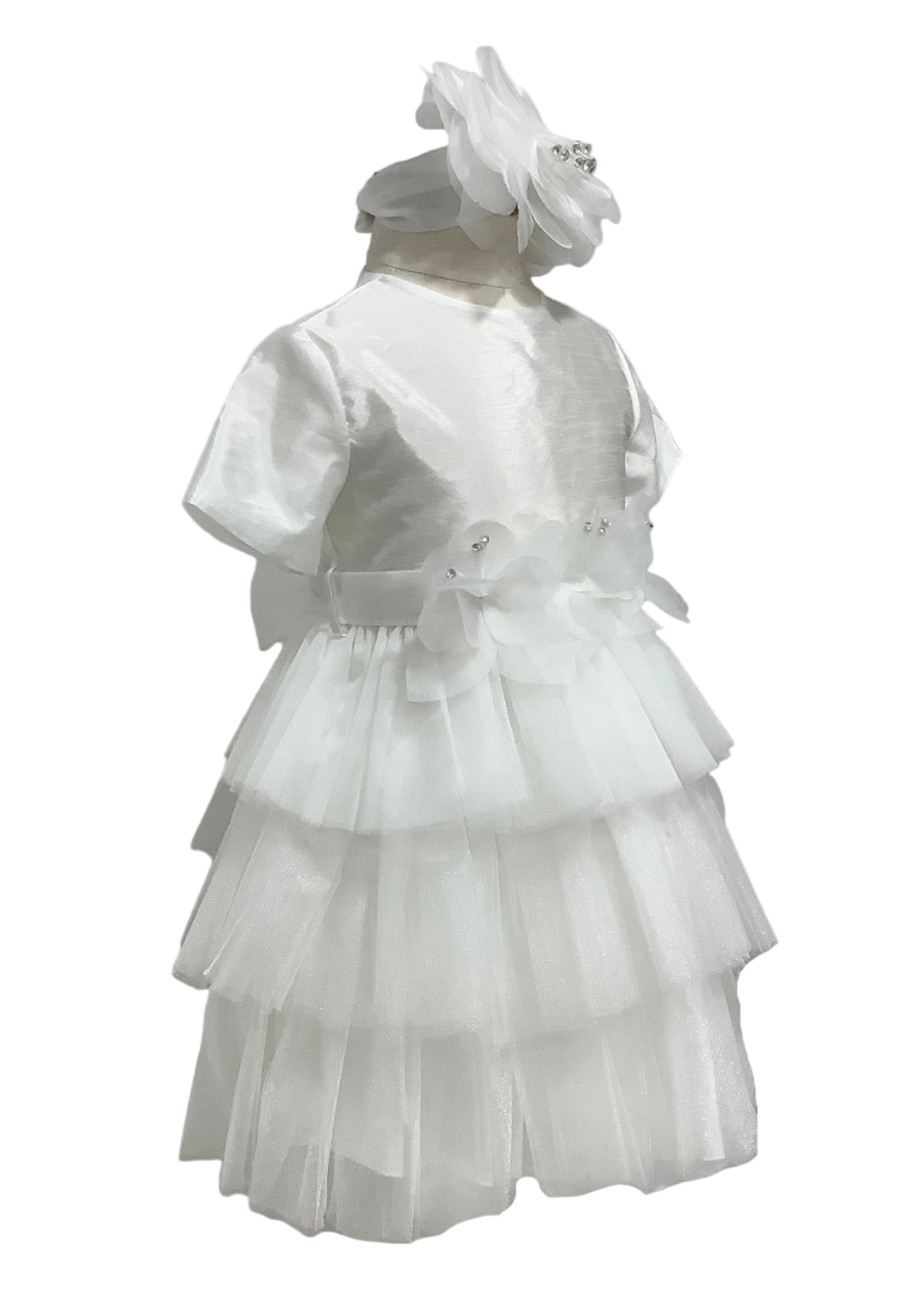 Elegant baby girl white dress. Soft silk fabric on chest and tulle skirt, designed with floral applique, round neck and zip fastening at the back. Comes with a matching floral applique hairband and silk belt.