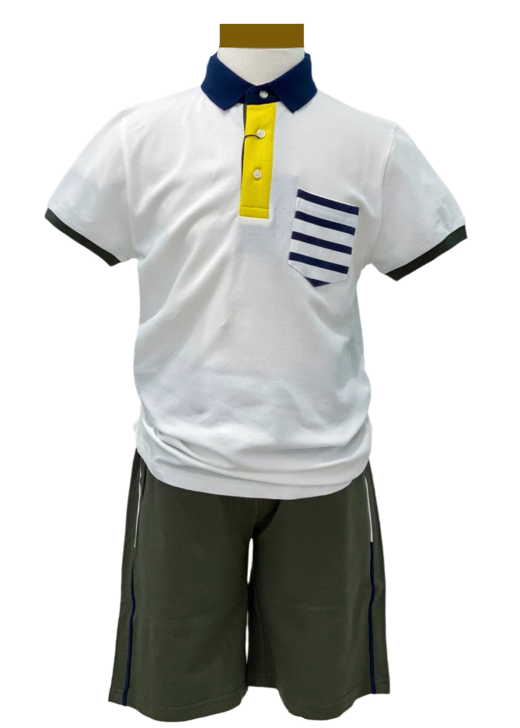 Made in soft cotton. Short sleeve polo in white with navy blue contrast collar and gray cuff and stripe pocket on the chest. Has branded button for fastening. Shorts has elasticated waistband with drawstring and two side pockets.
