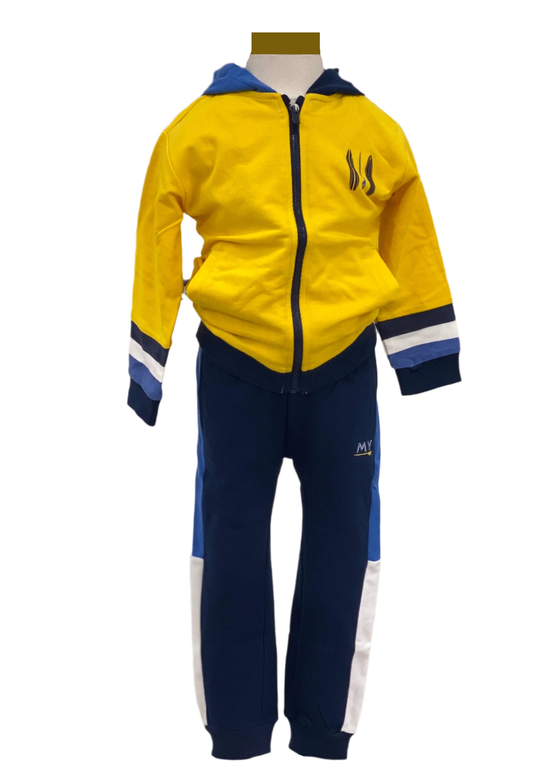 This tracksuit has hooded jacket, zip fastening that has pockets on both sides. Jacket is matched with a jogger pants with color block design on the sides.