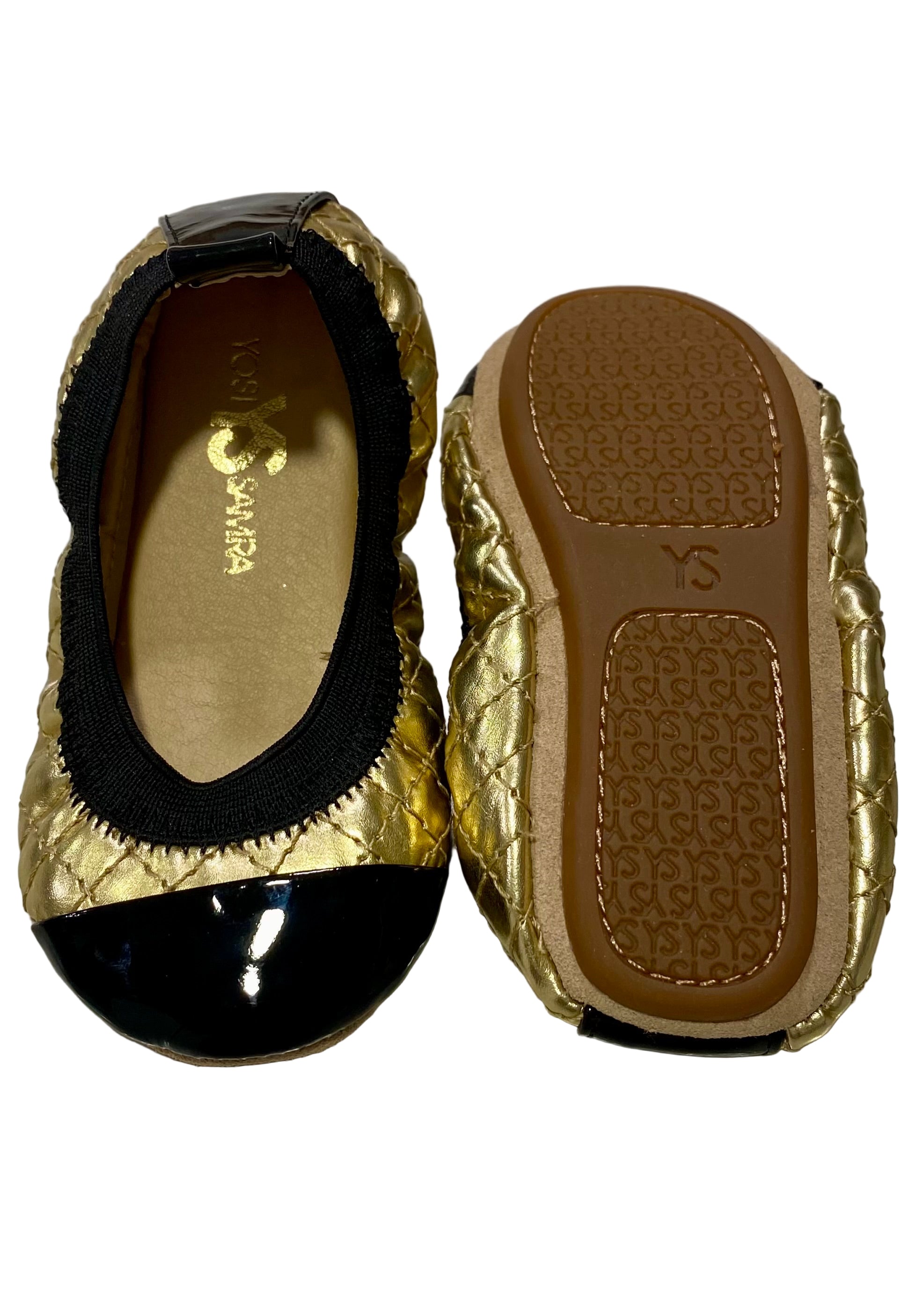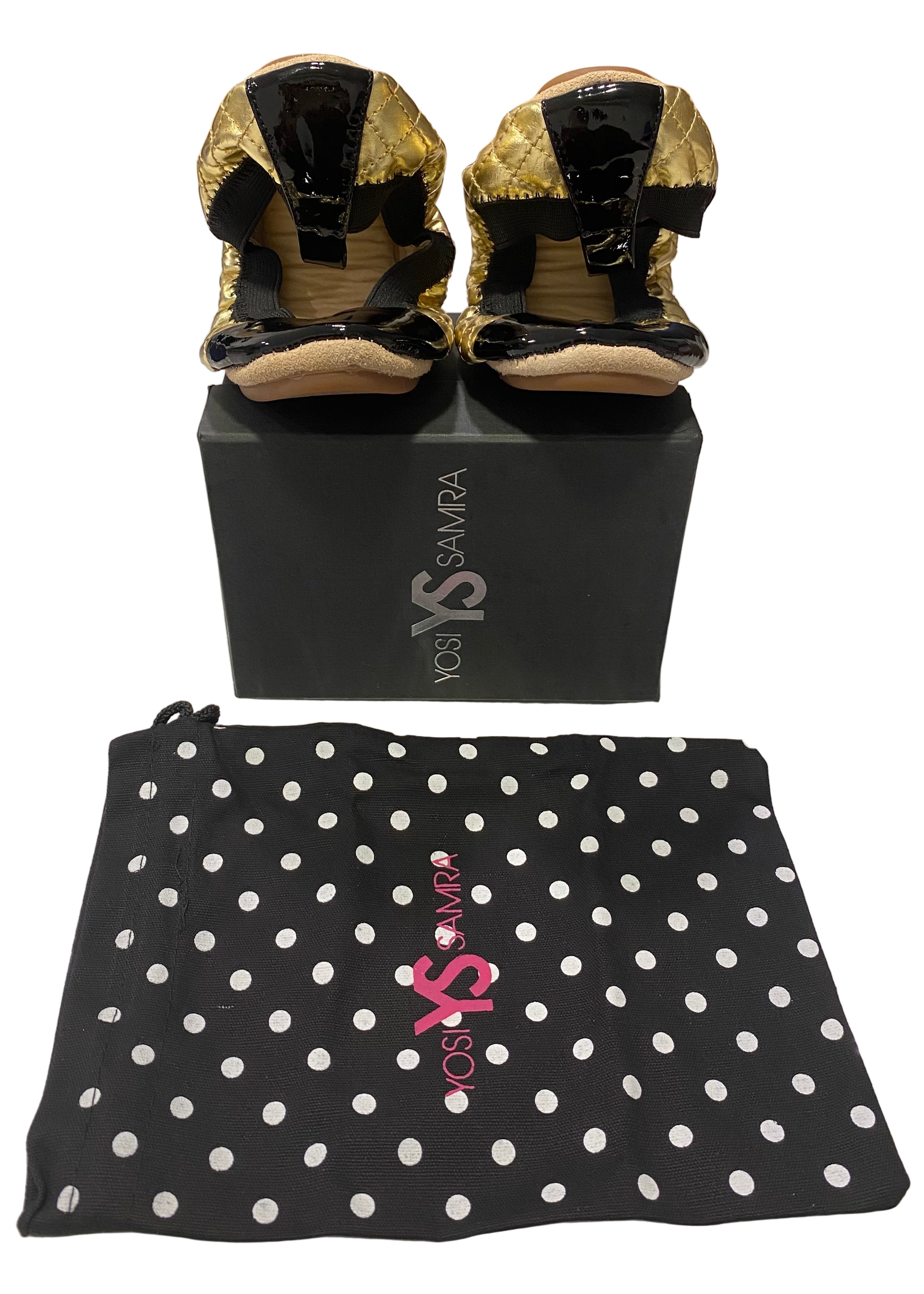Yosi Samra is a soft foldable leather flat shoe. Top line is elastic and padded insole. Rubber sole. Glossy heel cap and toe cap.