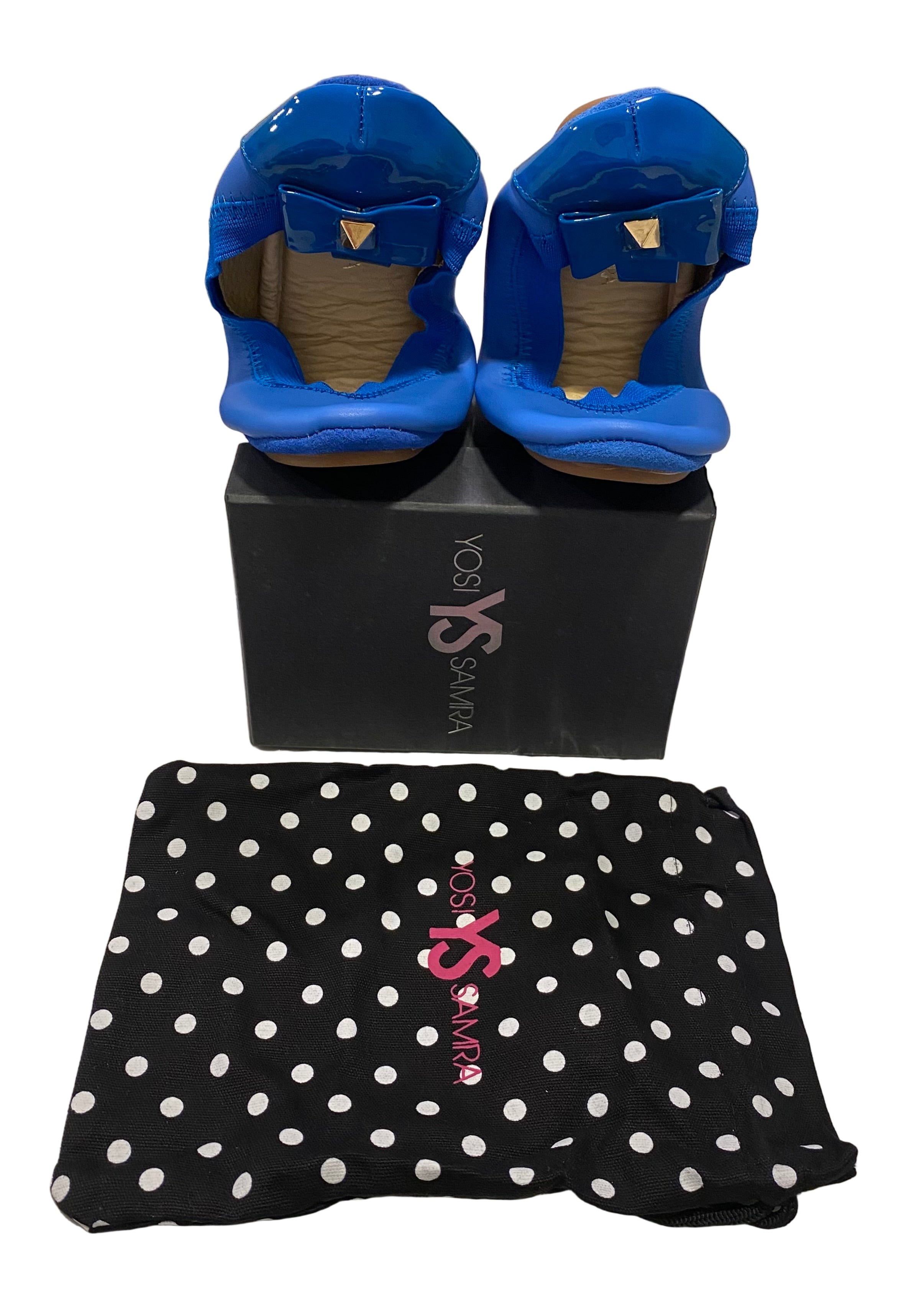 Yosi Samra is a soft foldable leather flat shoes. Top line is elastic and padded insole. Rubber sole. Glossy heelcap designed with a bow and gold metal stud.