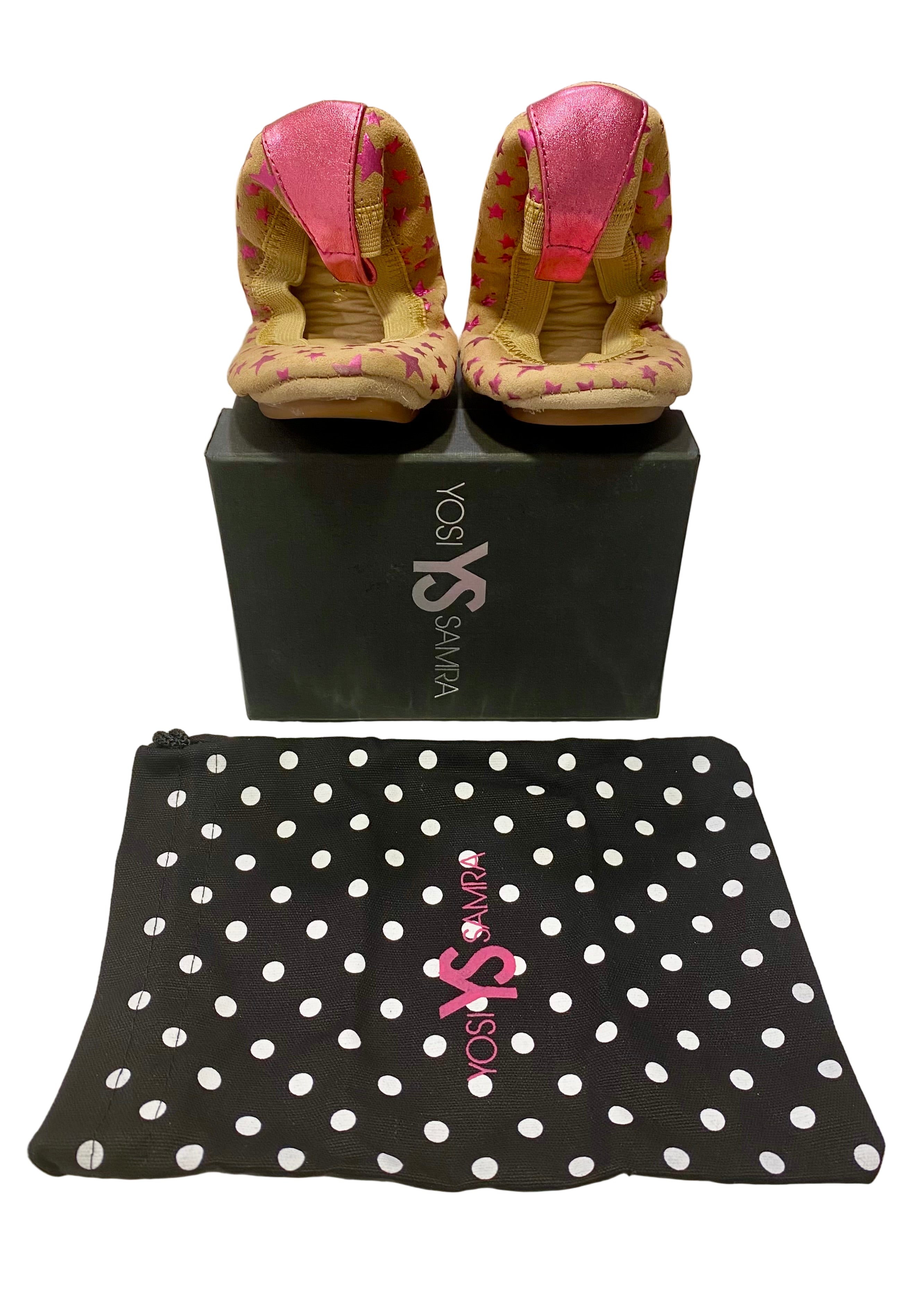 Yosi Samra is a soft foldable leather flat shoe. Top line is elastic and padded insole. Rubber sole. Glossy heel cap, with pink star design.