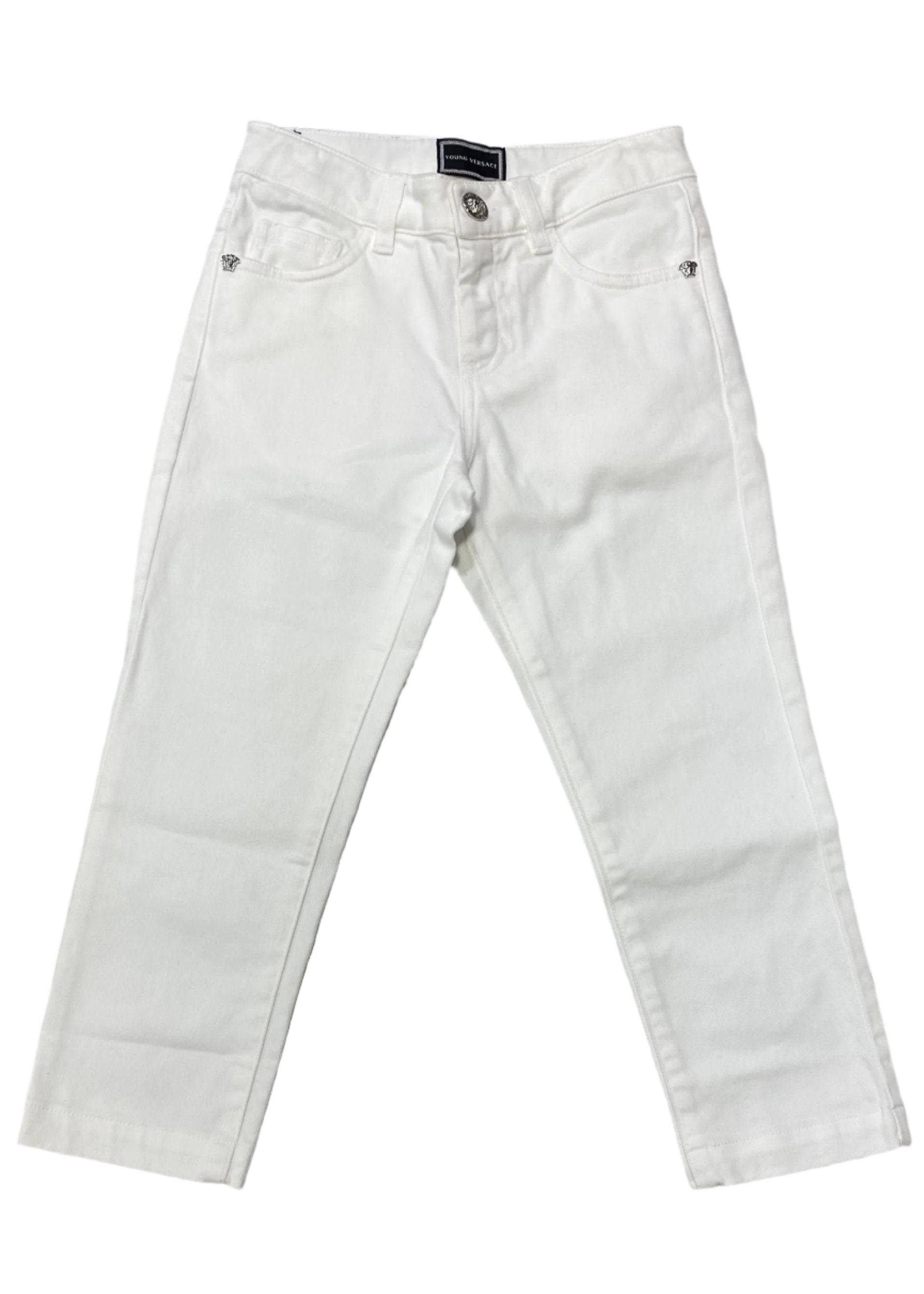 Plain color jeans from Young Versace with medusa button. This pair of jeans has a standard five pockets, each is finished with medusa rivets.