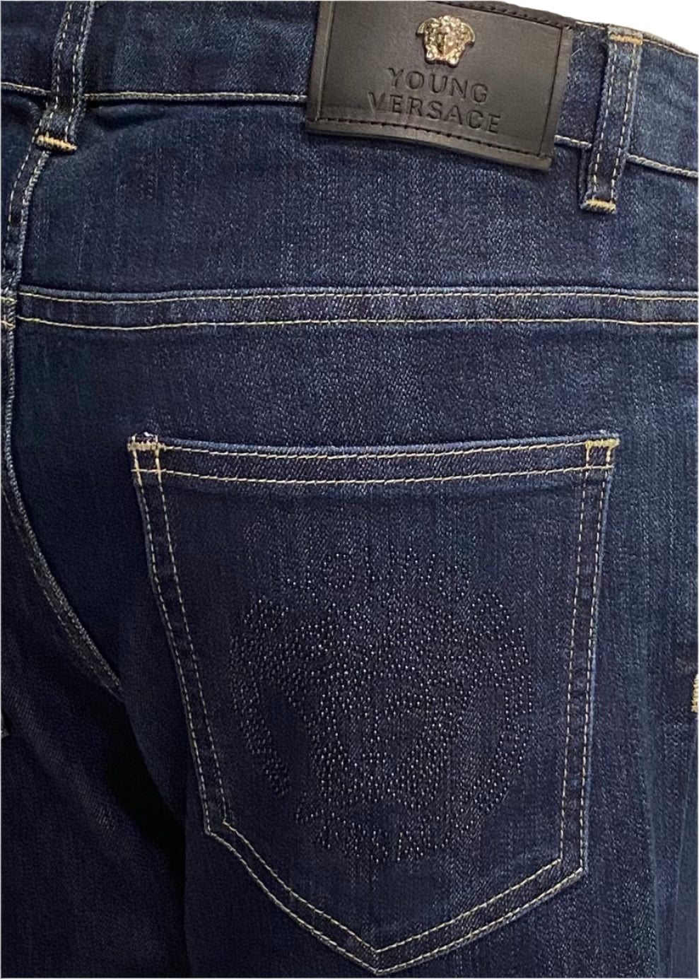 A regular fit denim jeans by Young Versace. It has a standard five pockets. Front pocket has the designer's logo rivet at the bottom tip. Zip-up front opening with a designer's button logo. Back pocket is designed with black studs designer's logo. Made in Italy.