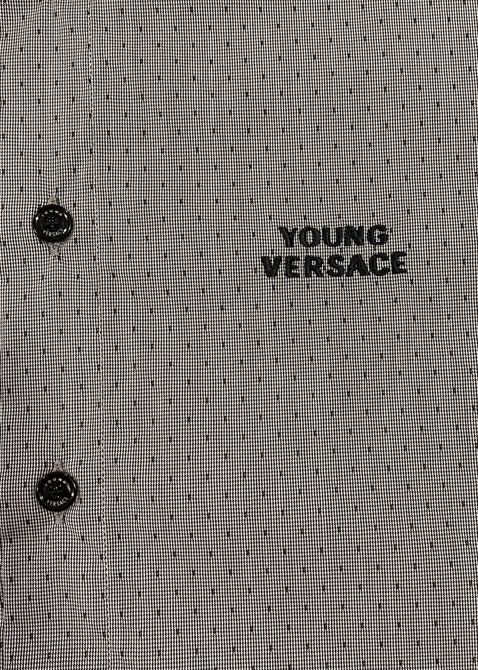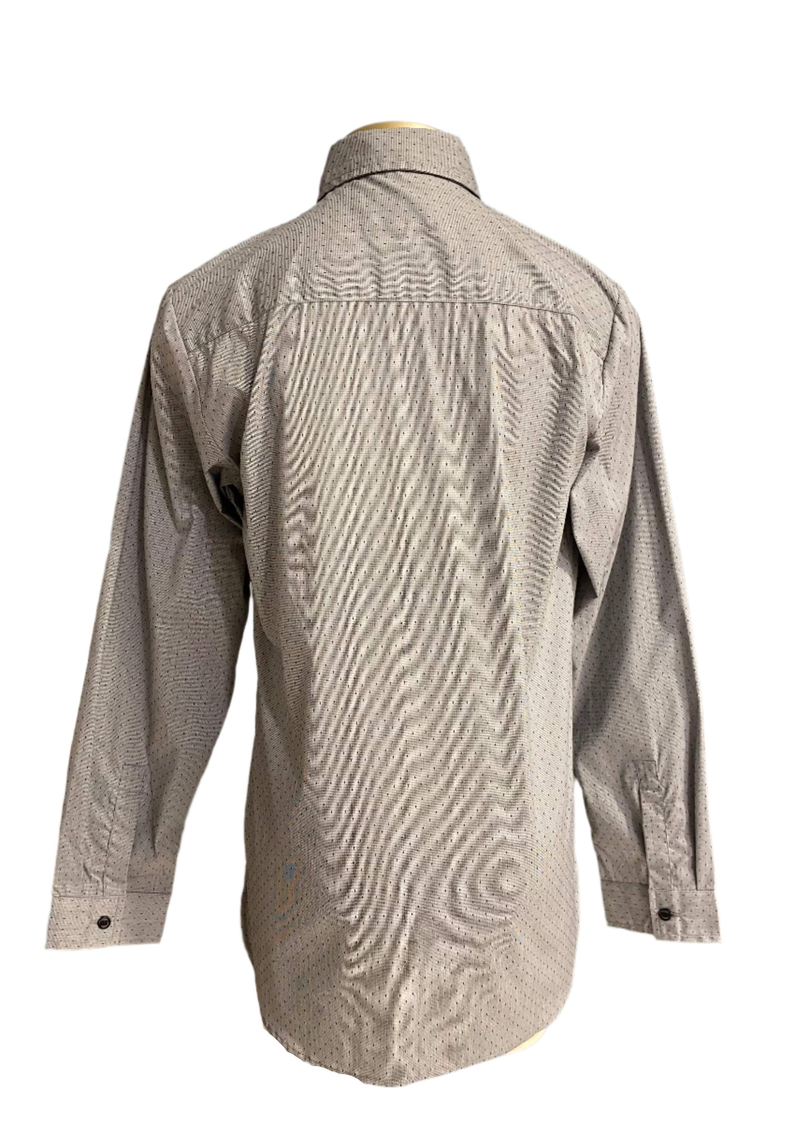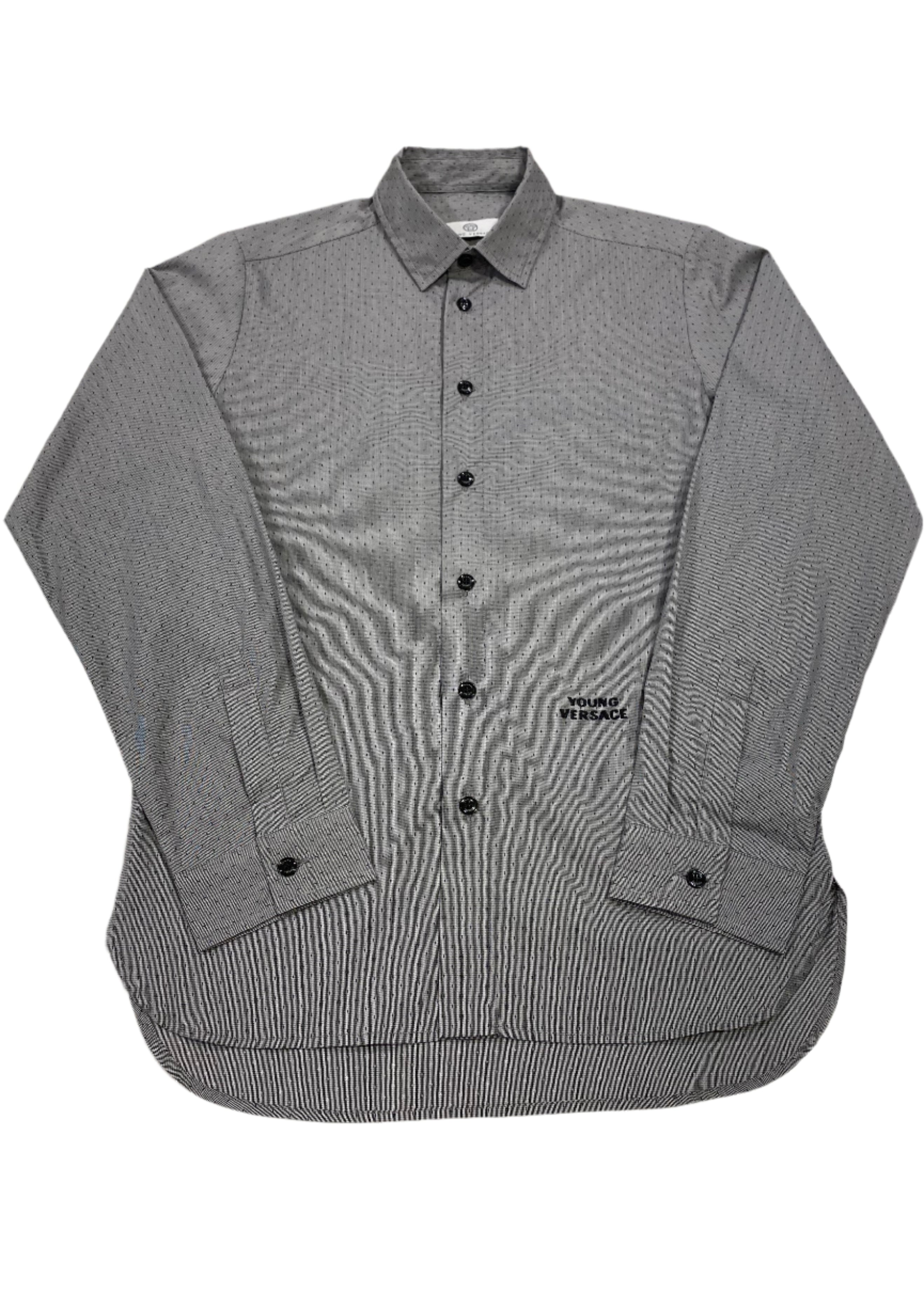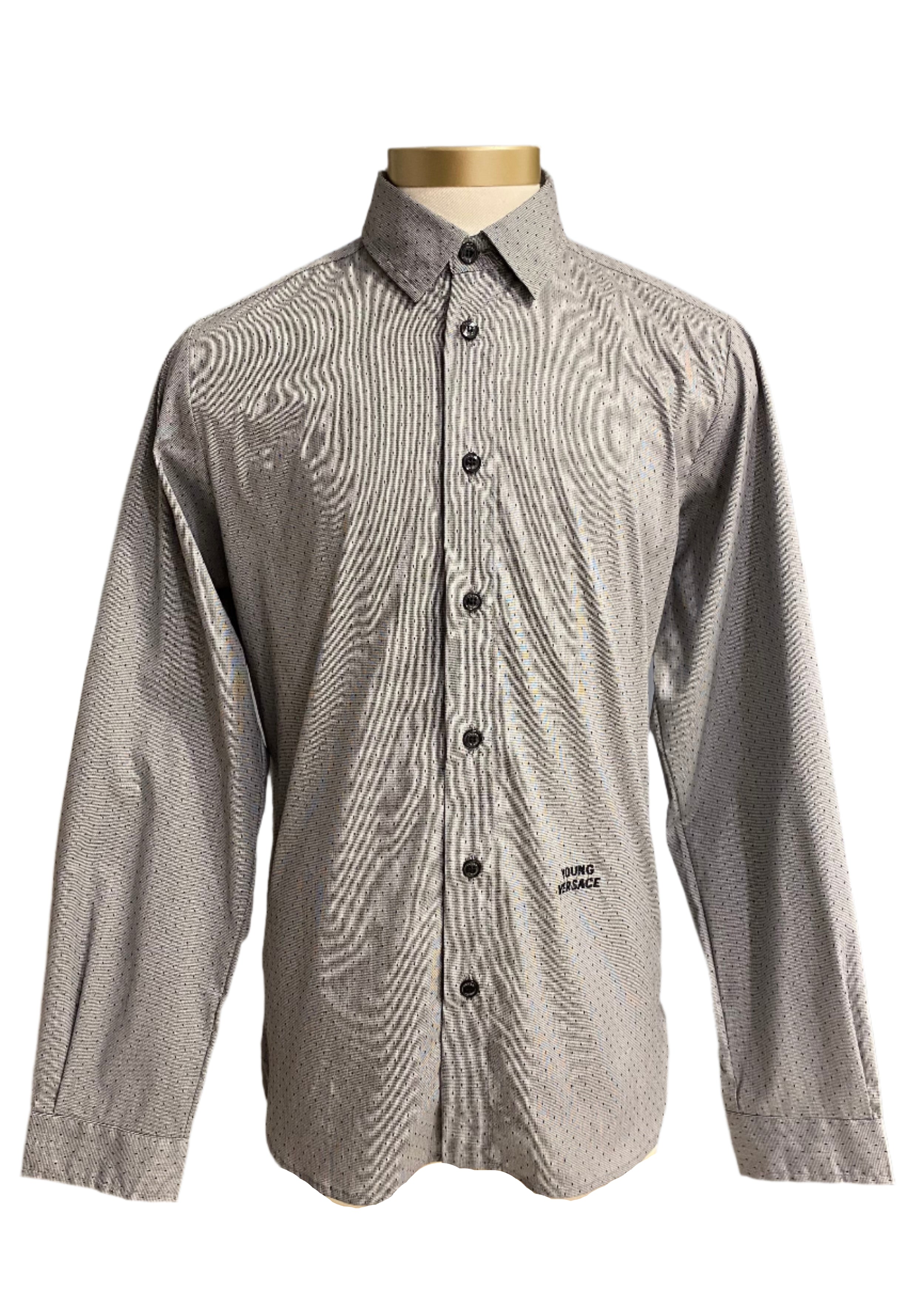 A long stand with a standard collar type of shirt. It has an all over micro dot embroidery as a design. Front placket, french cuff type. Long back. Designer's name is embroidered just above its hem. Made in Italy by Young Versace.