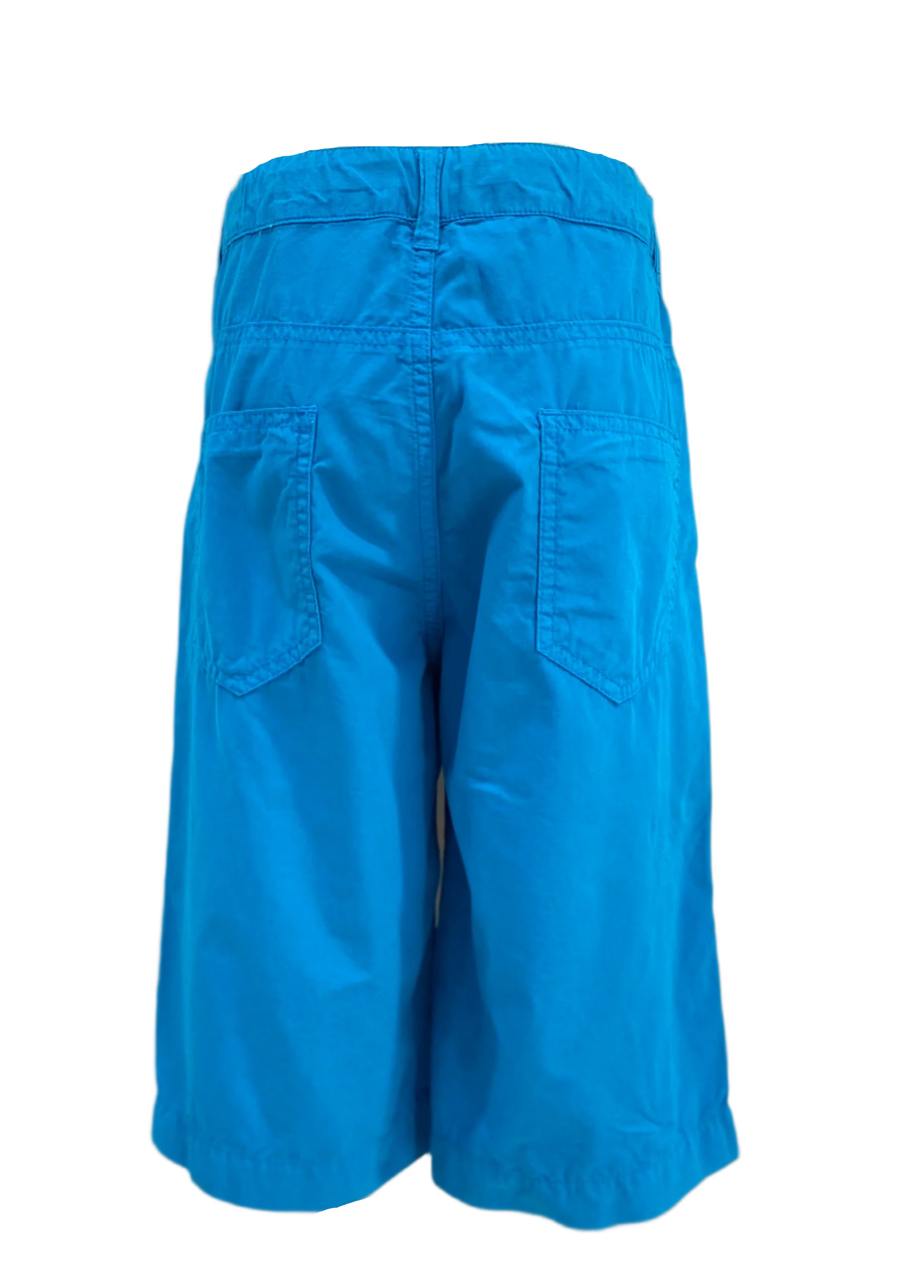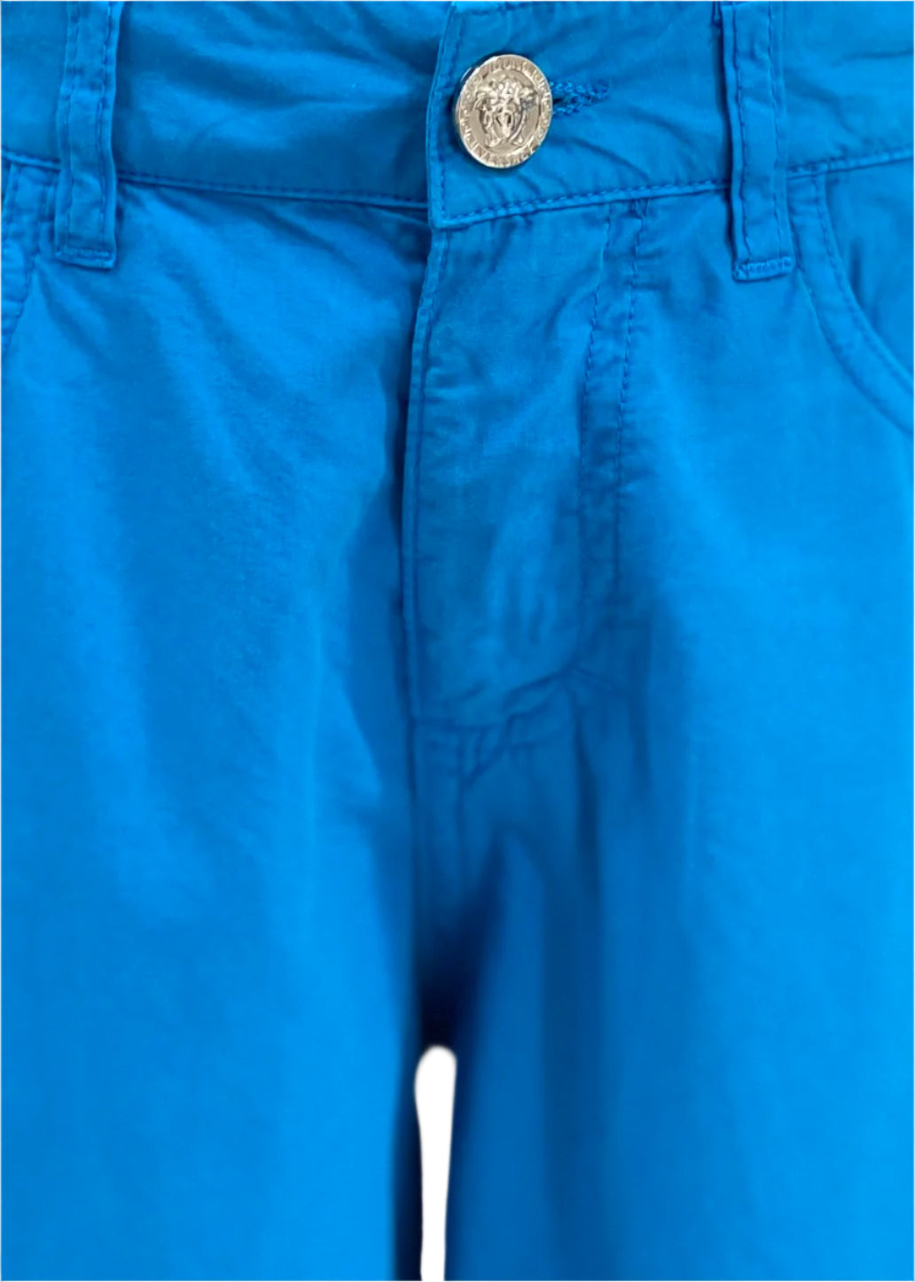 This plain blue short designed with pockets front and back, it has a coin pocket at the right side in front. Adjustable waistband. Rubber brand name with medusa head at the left hem. Zipper for opening.