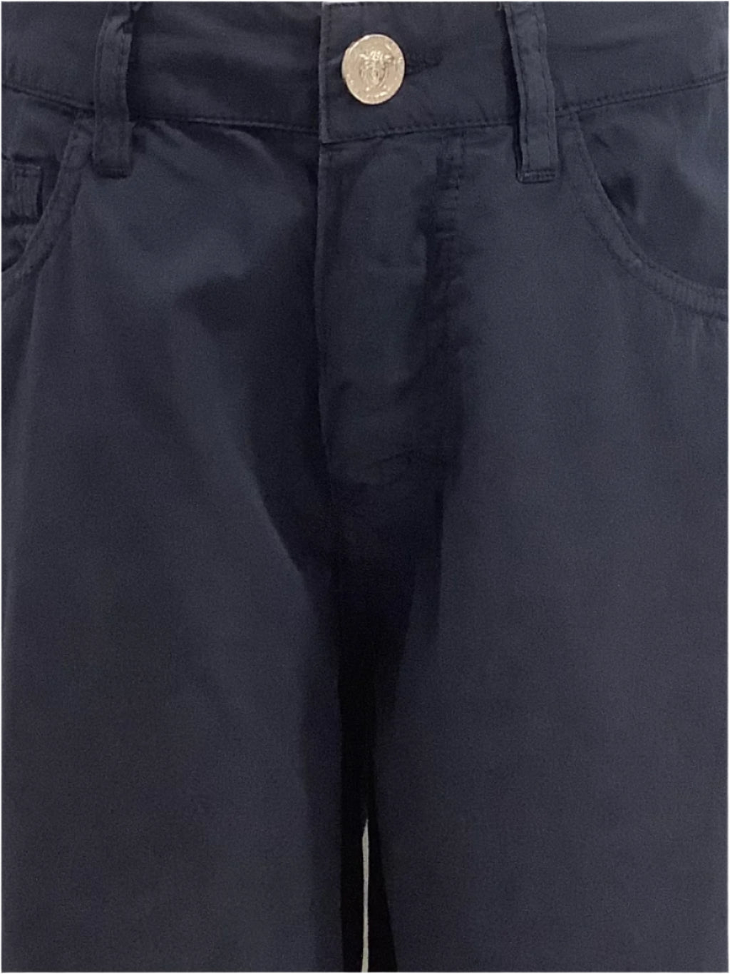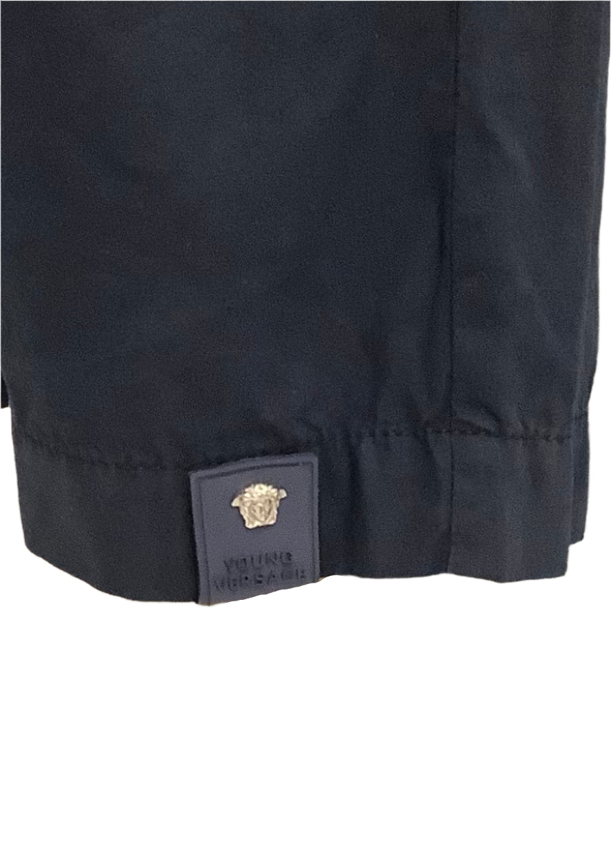 This plain navy blue short designed with pockets front and back, it has a coin pocket at the right side in front. Adjustable waistband. Rubber brand name with medusa head at the left hem. Zipper for opening.