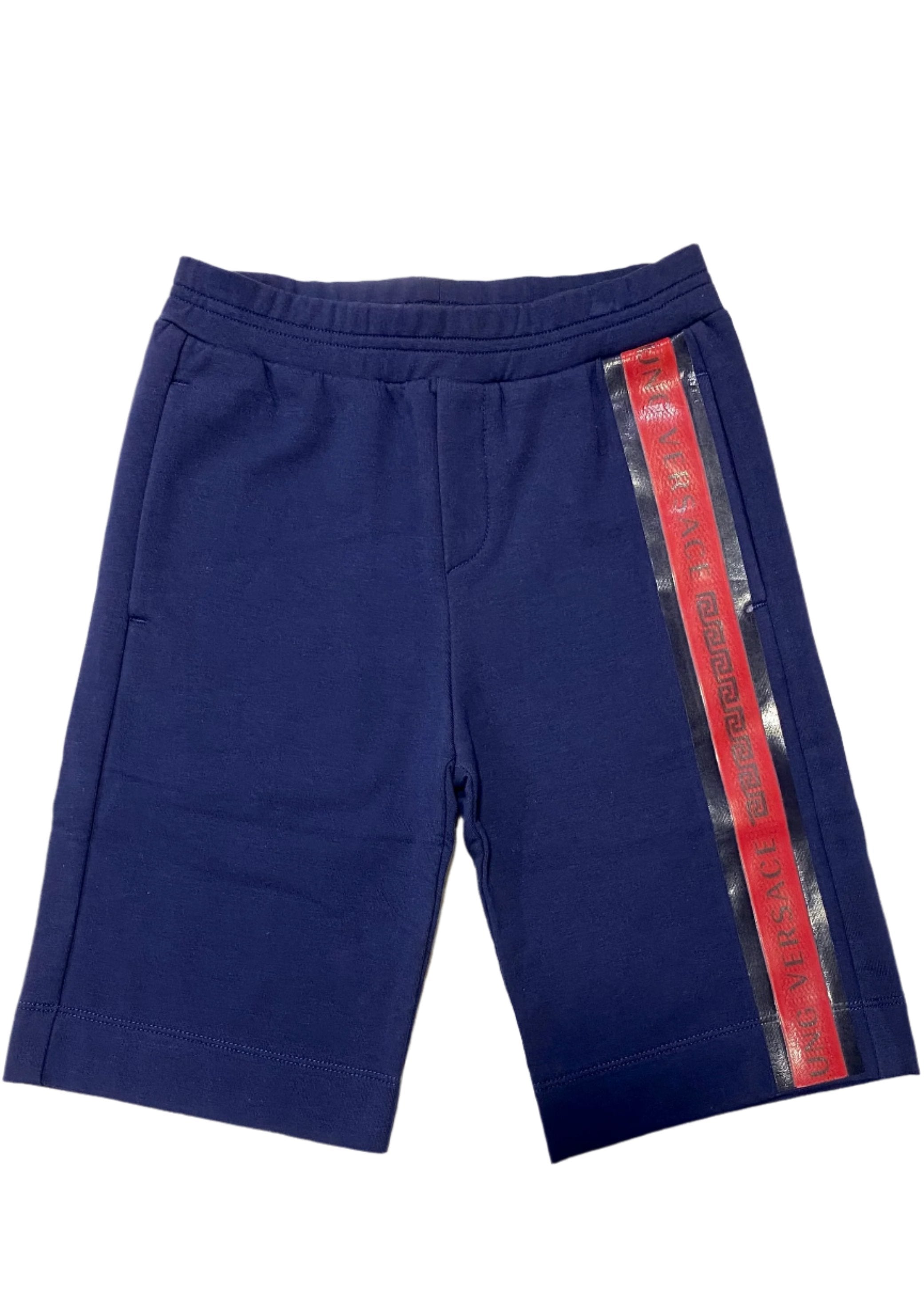 A Young Versace blue short designed with red and black Greek fret style and a brand name Young Versace. It has two pockets in front. Elasticated waistband. Made in Italy.