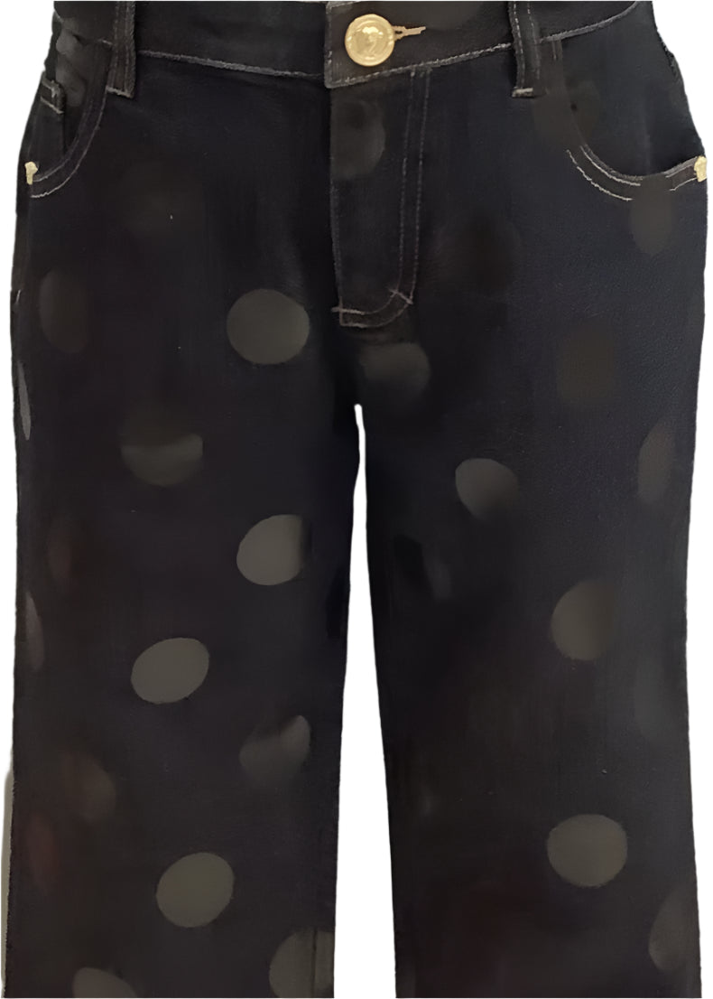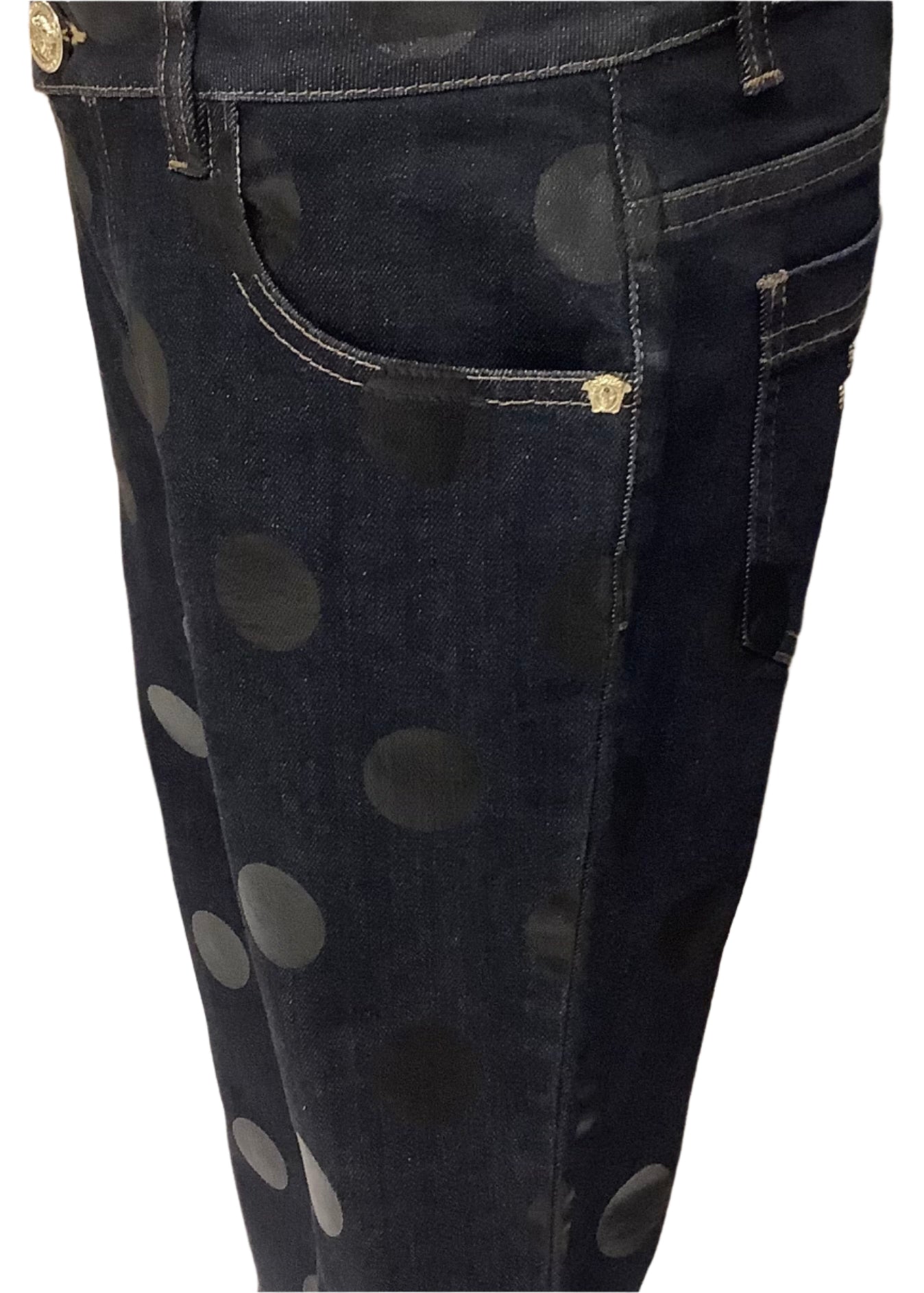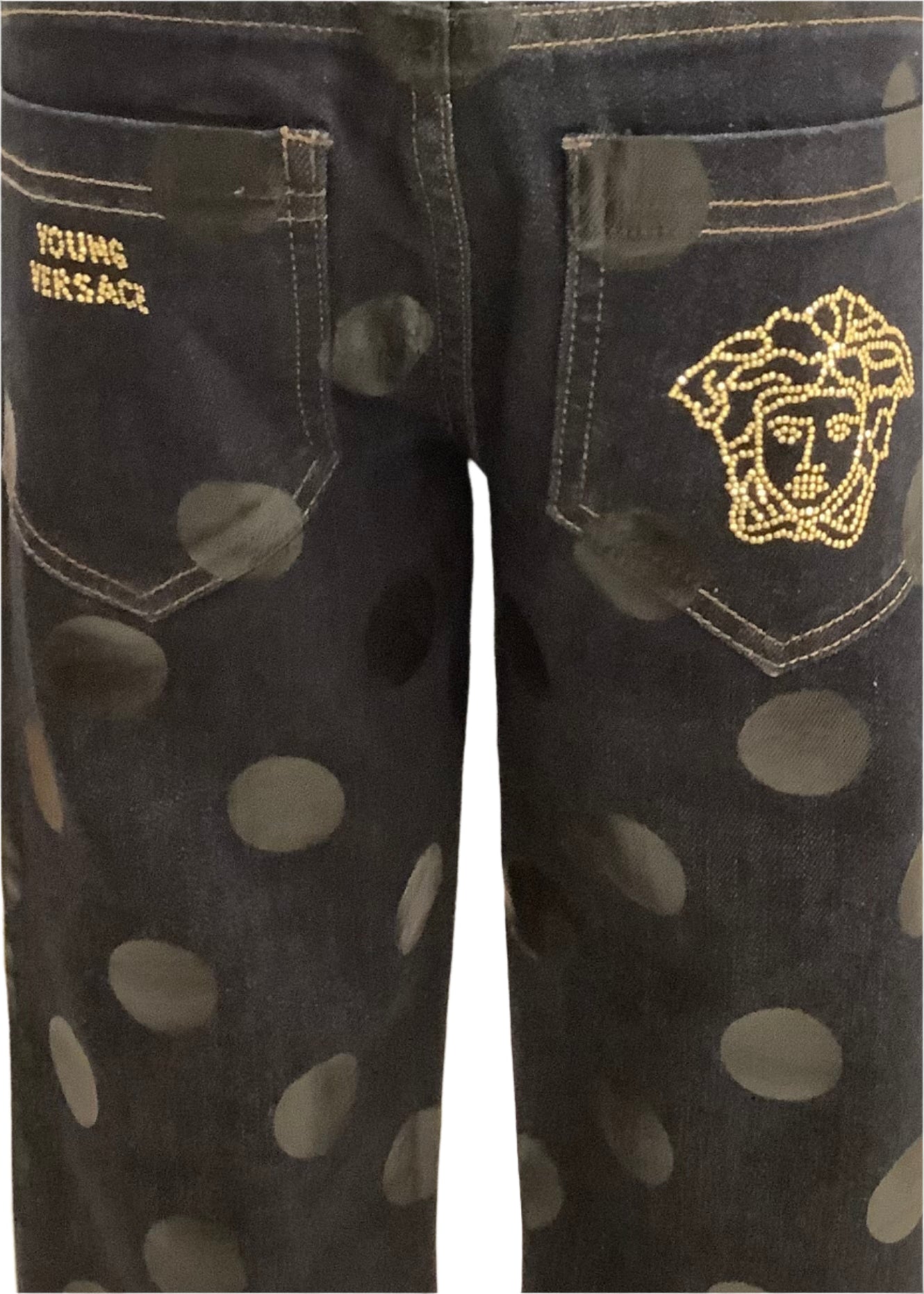 A stretchy jeans from Versace. Made with 98% cotton and 2% elastane fabric. It is soft and comfortable to wear. It has a black polka dot design and a "young versace" studs on the back pocket. For casual wear.