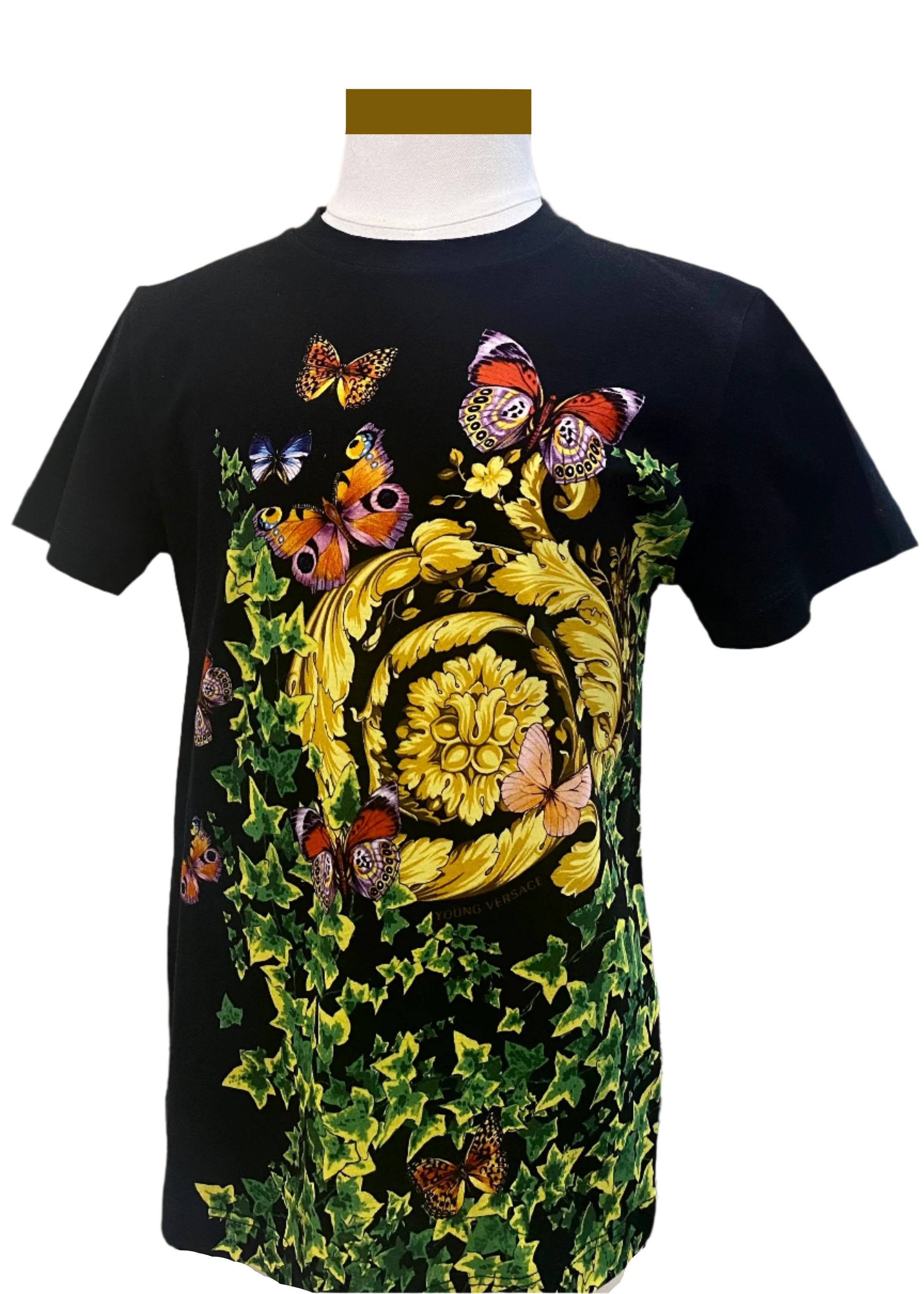 A colorful casual top from Young Versace. It has round neck, short sleeves and is designed with leaves, butterflies and its signature baroque print.